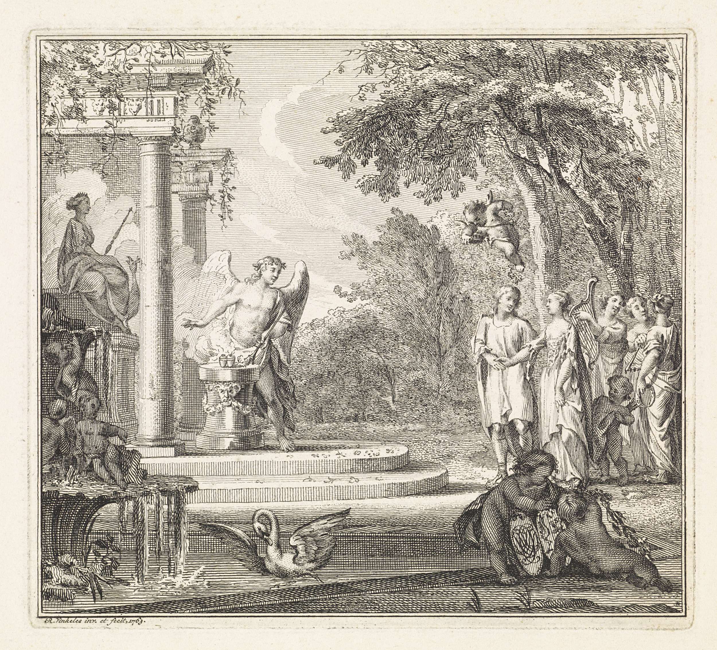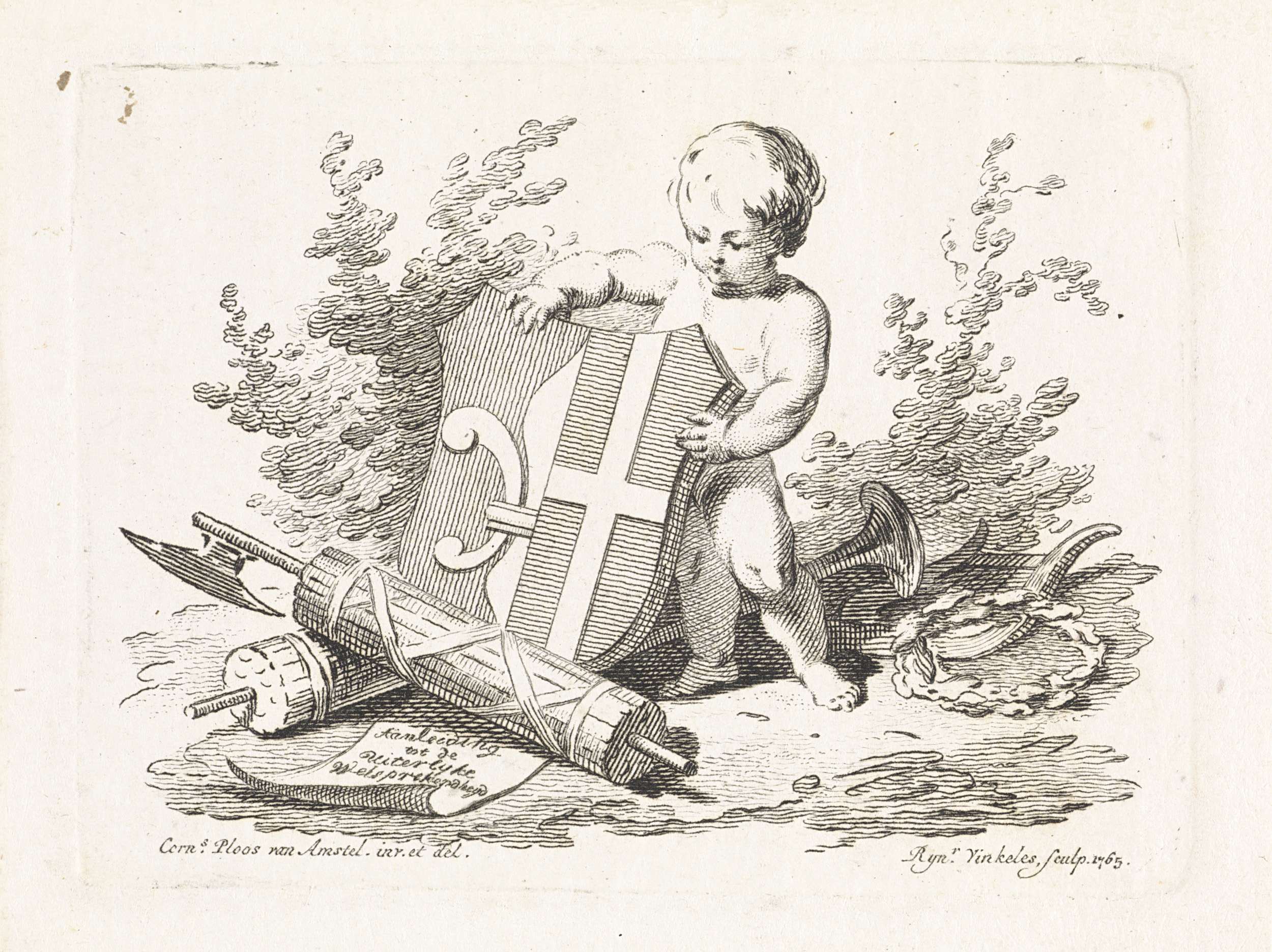 Putto strooit bloemen over allegorische attributen