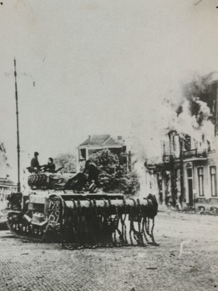 Foto Sherman Crab vlegel tank voor brandend gebouw