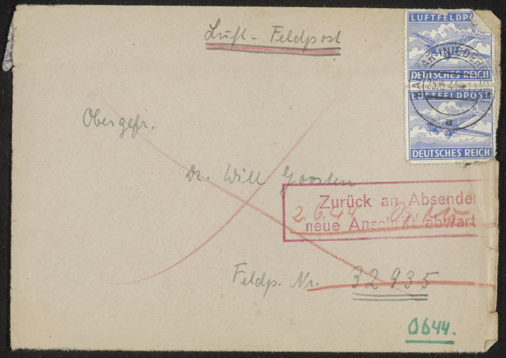 cremekleurige envelop luftfeldpost Kalkar 25.6.'44
