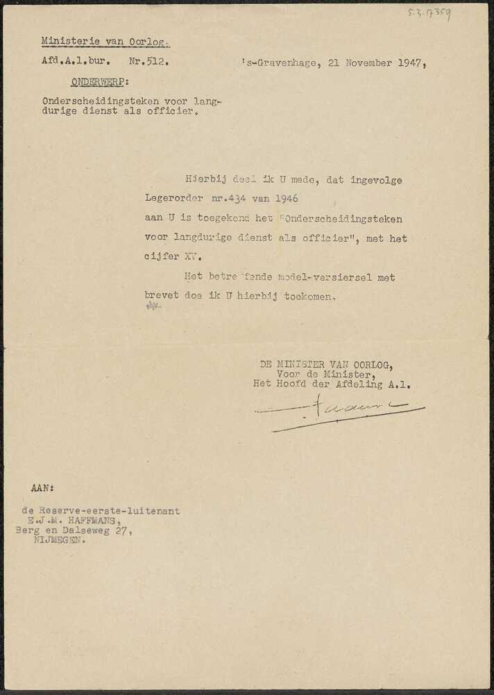 Getypte brief van kapitein H.J. Brouwers met gegeven...