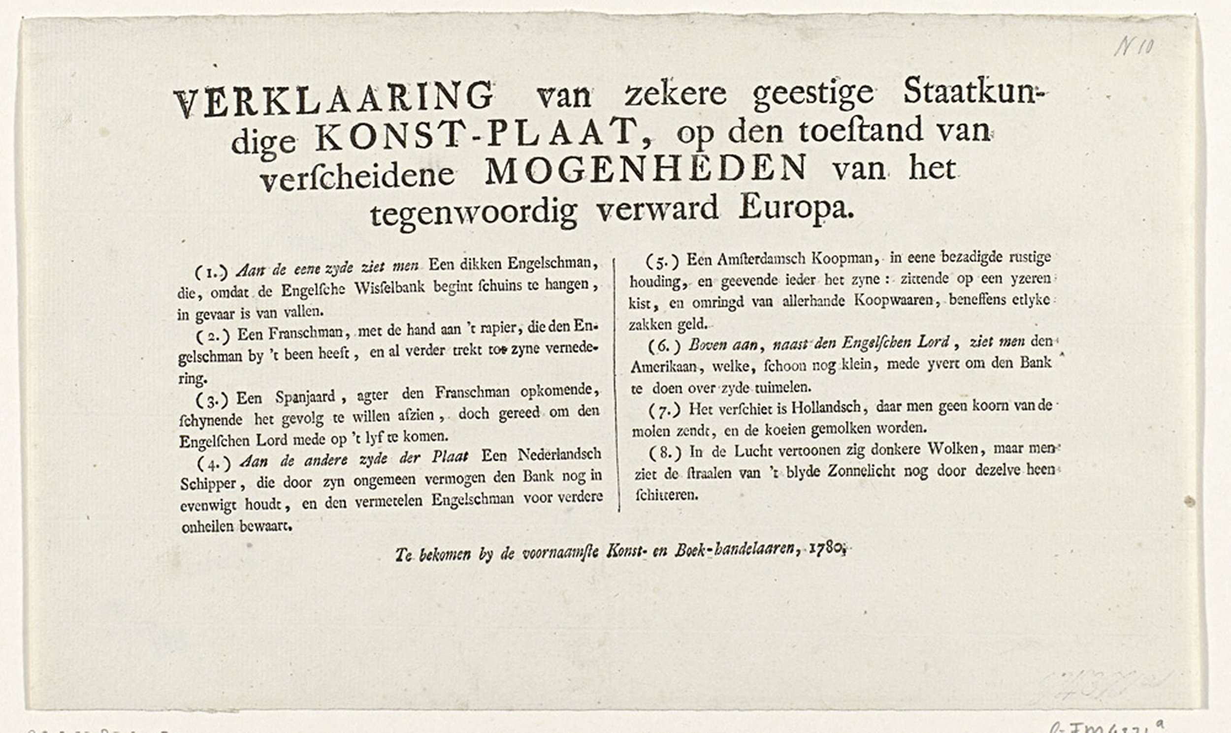 Tekstblad in het Frans bij de spotprent met de Brits...