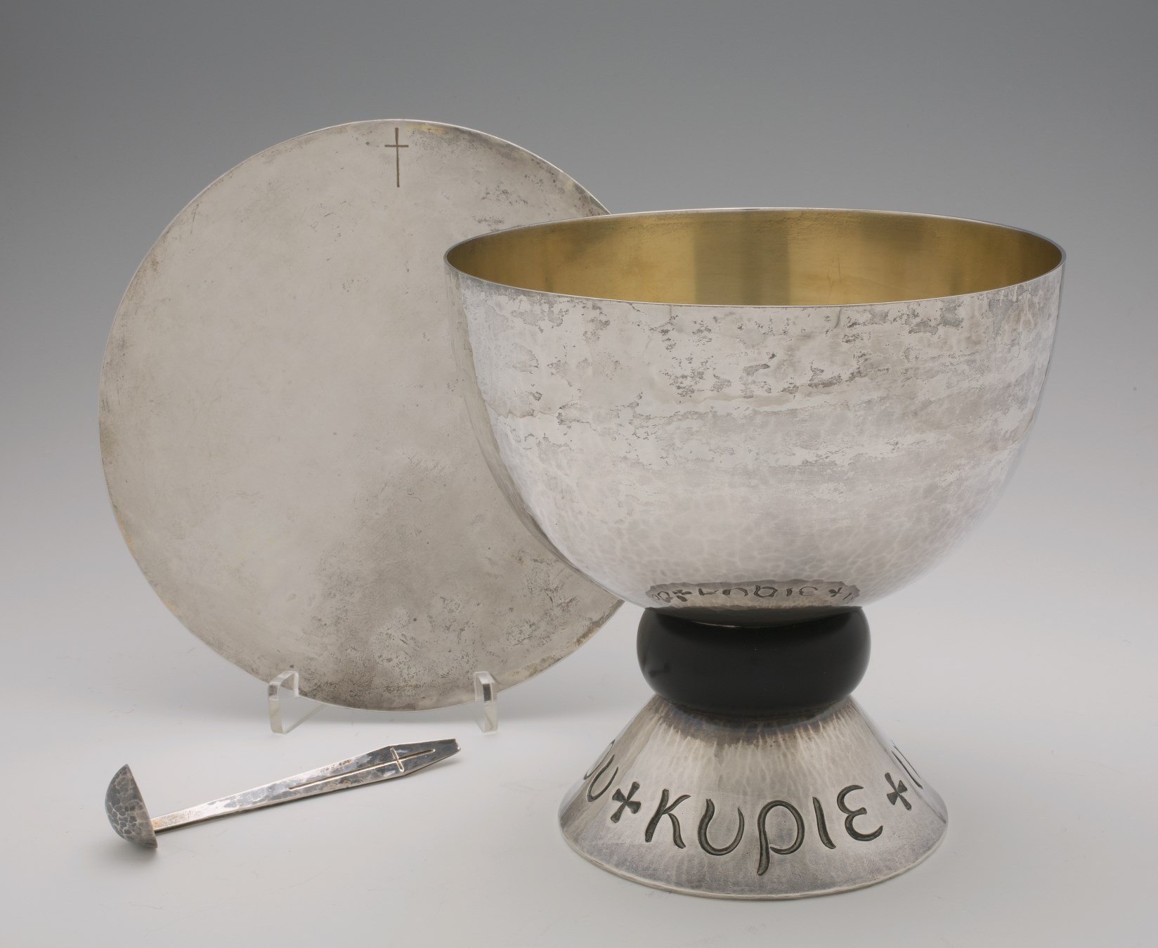 Kelklepel met gegraveerd kruis op platte steel