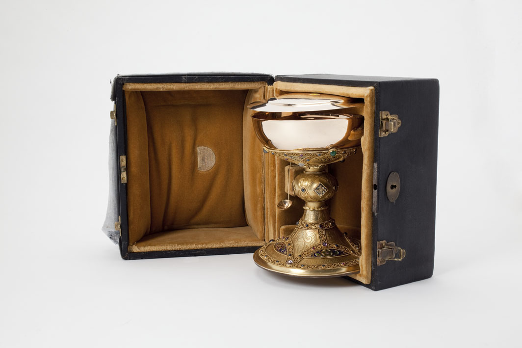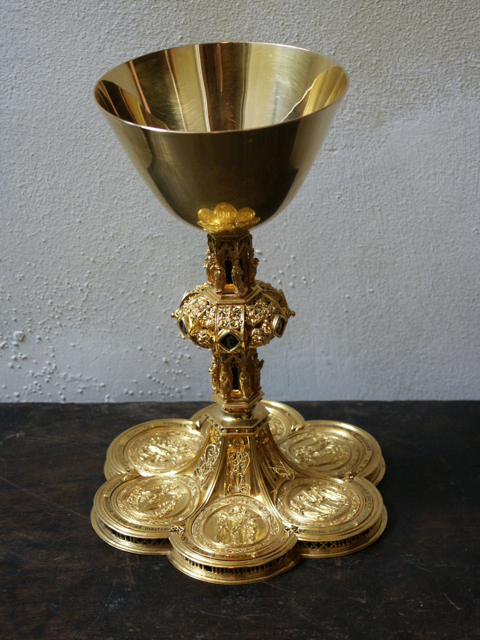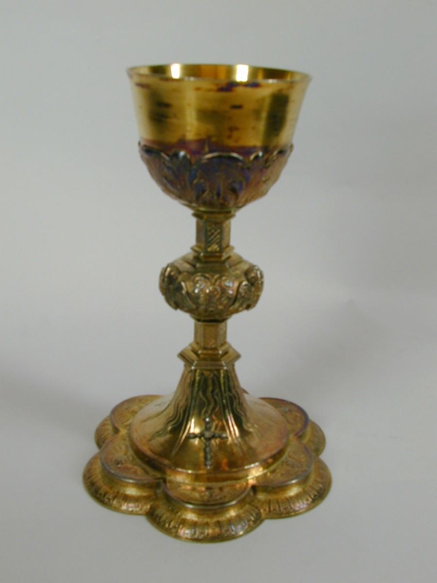 Kelk op achtlobbige voet waarop o.a. Jacobus Maior, ...