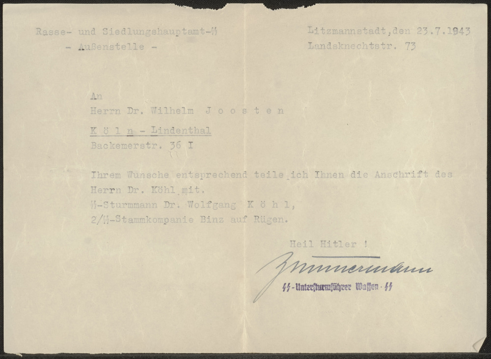 Brief van de "Rassen- und Siedlungshauptamt-SS