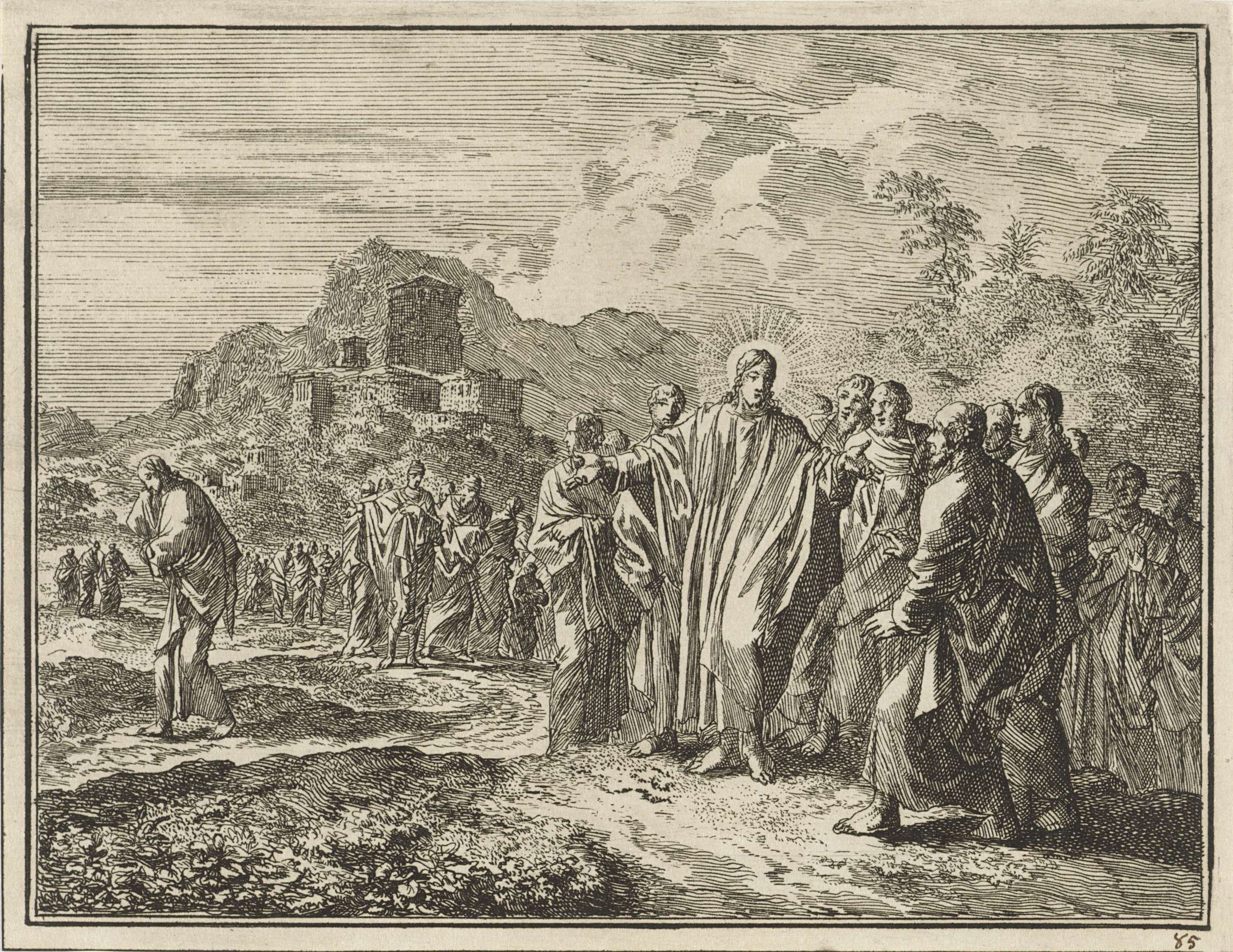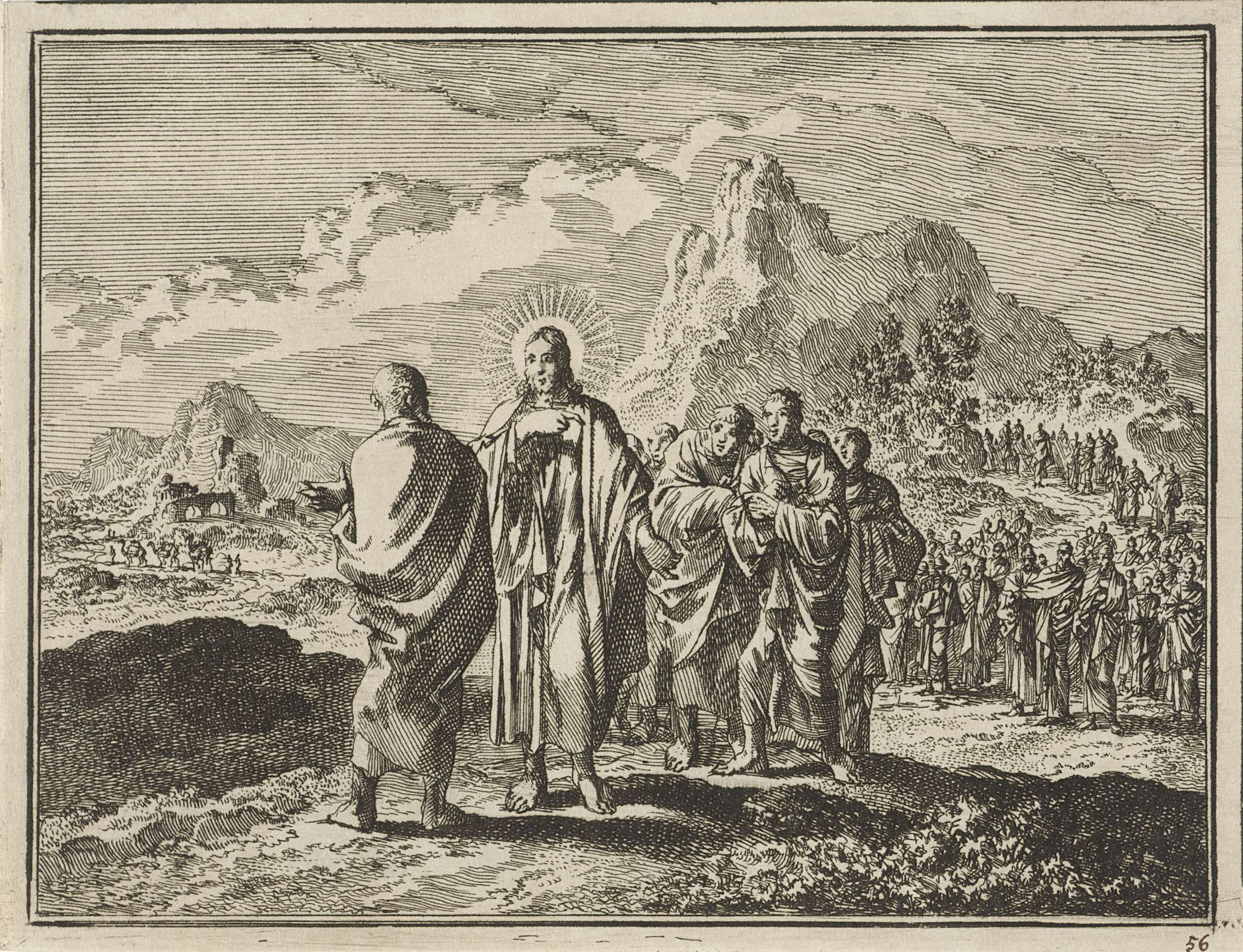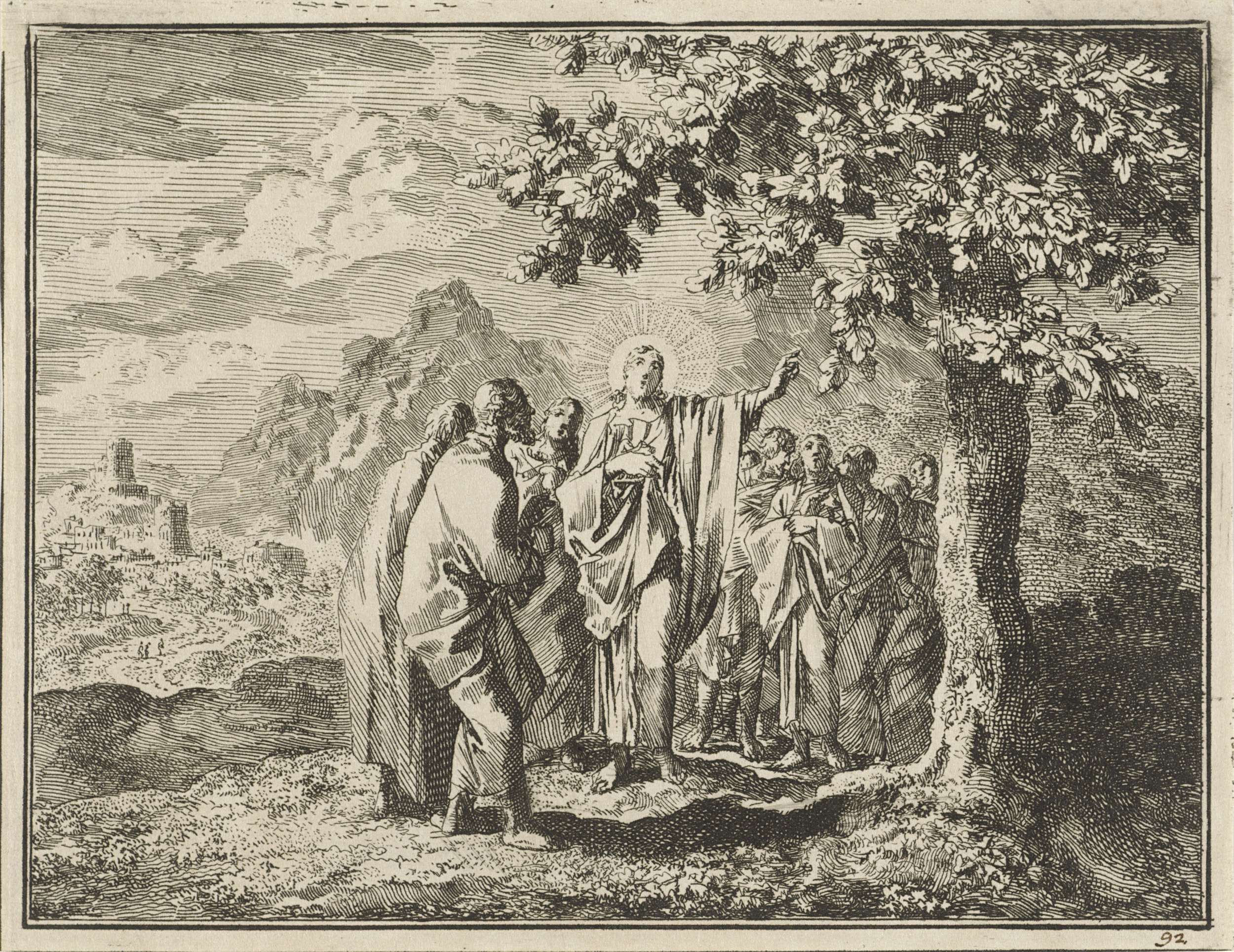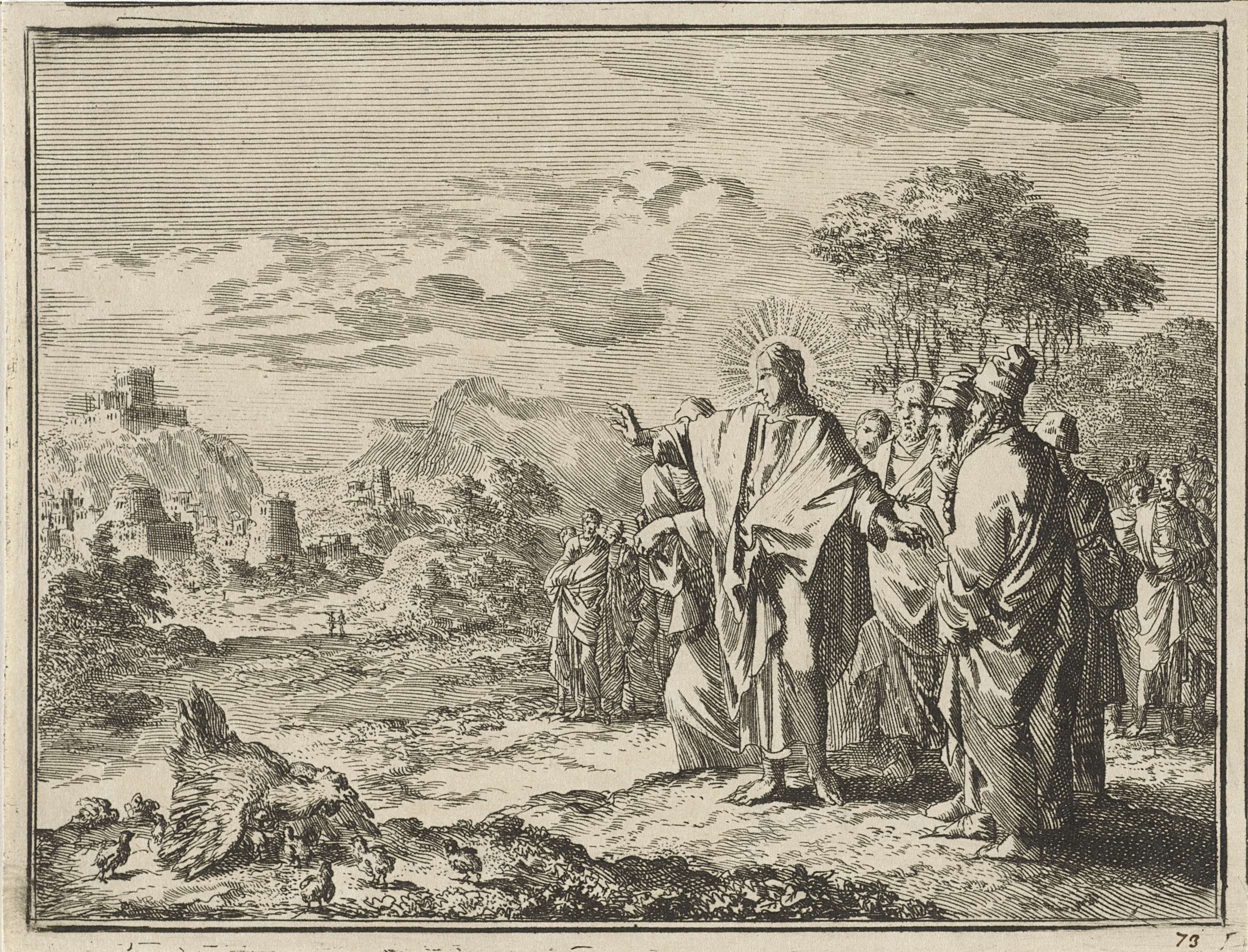 Christus wijst zijn discipelen op een klokhen die ha...