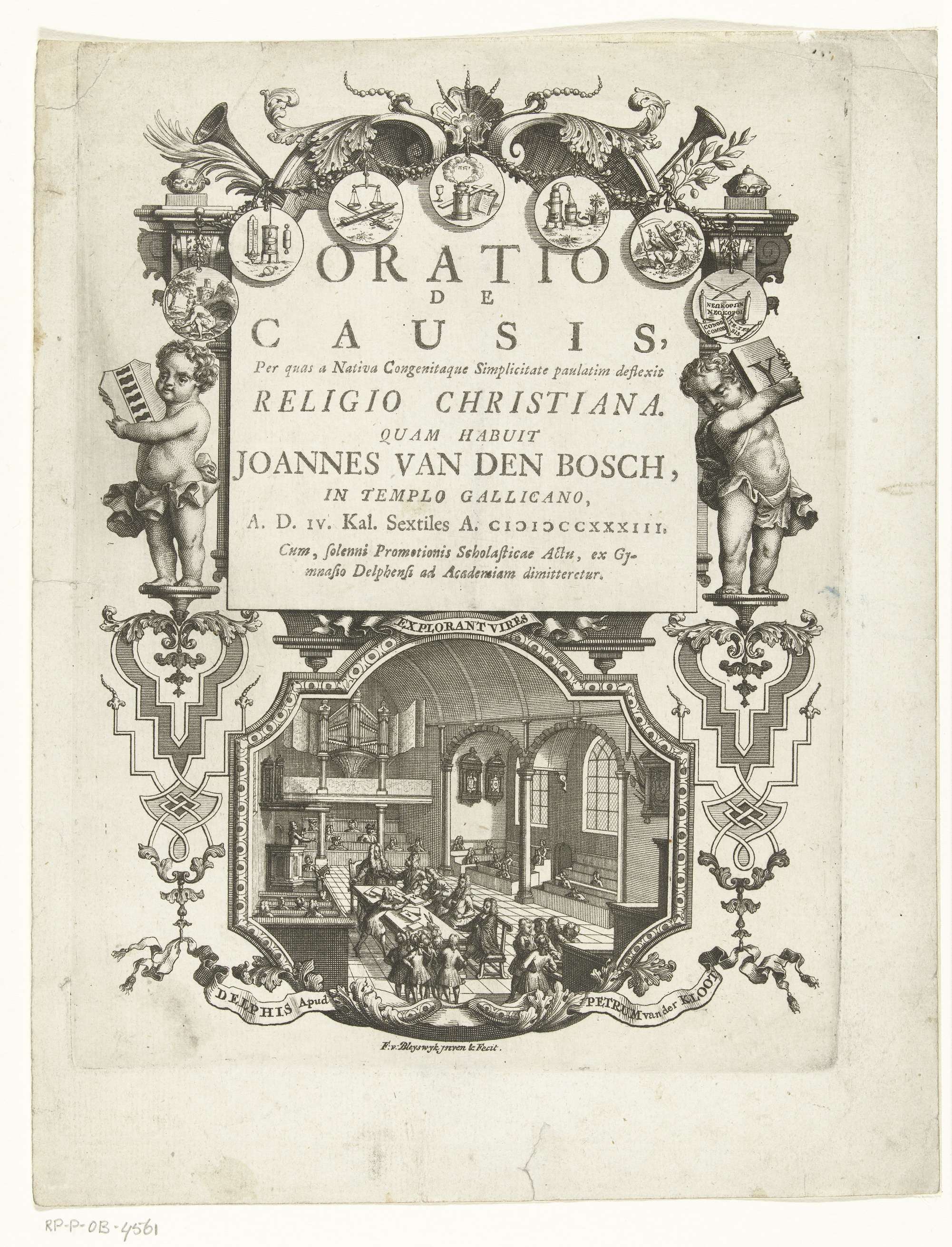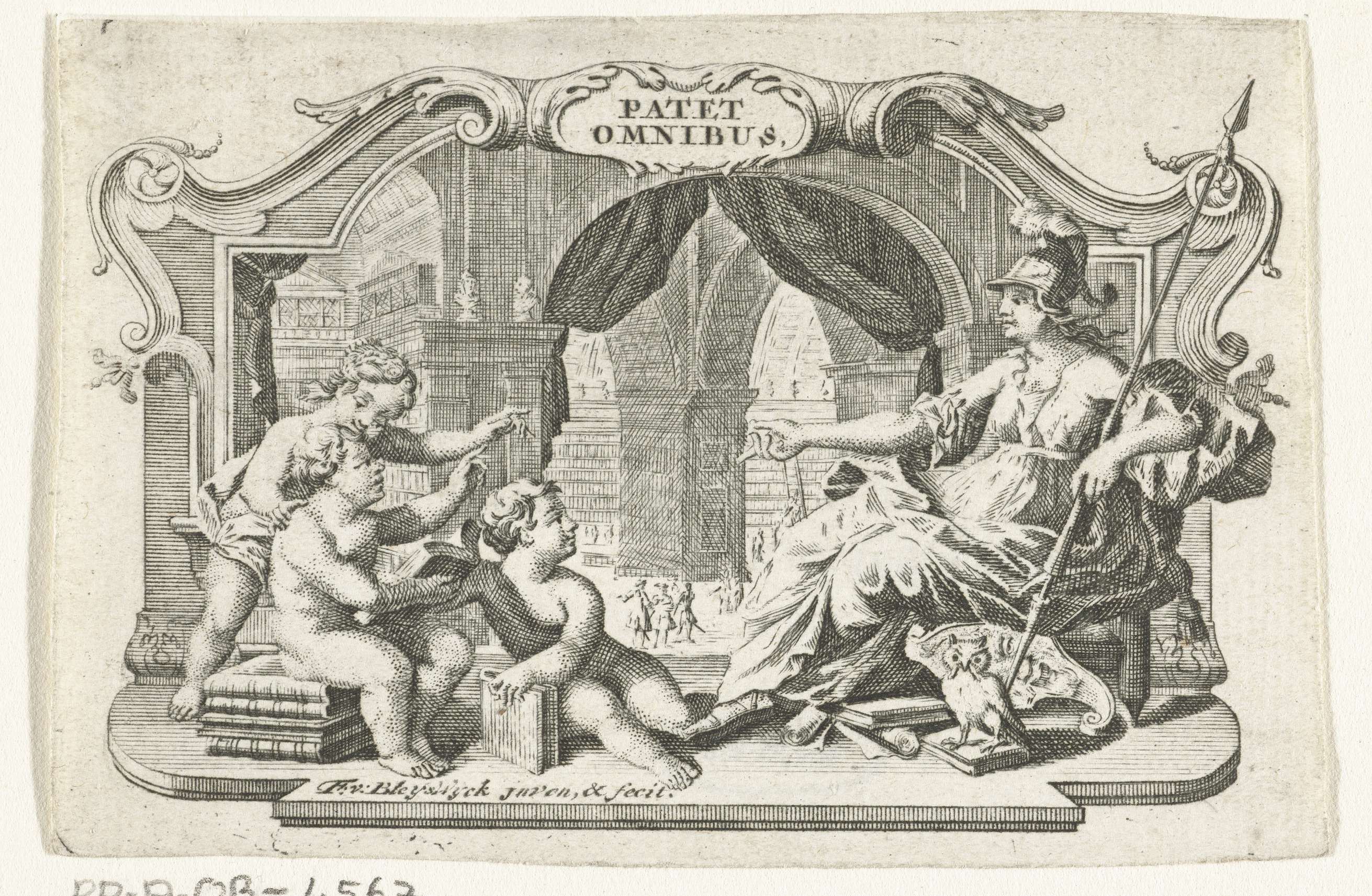 Titelvignet met bibliotheek en godin Minerva en putt...