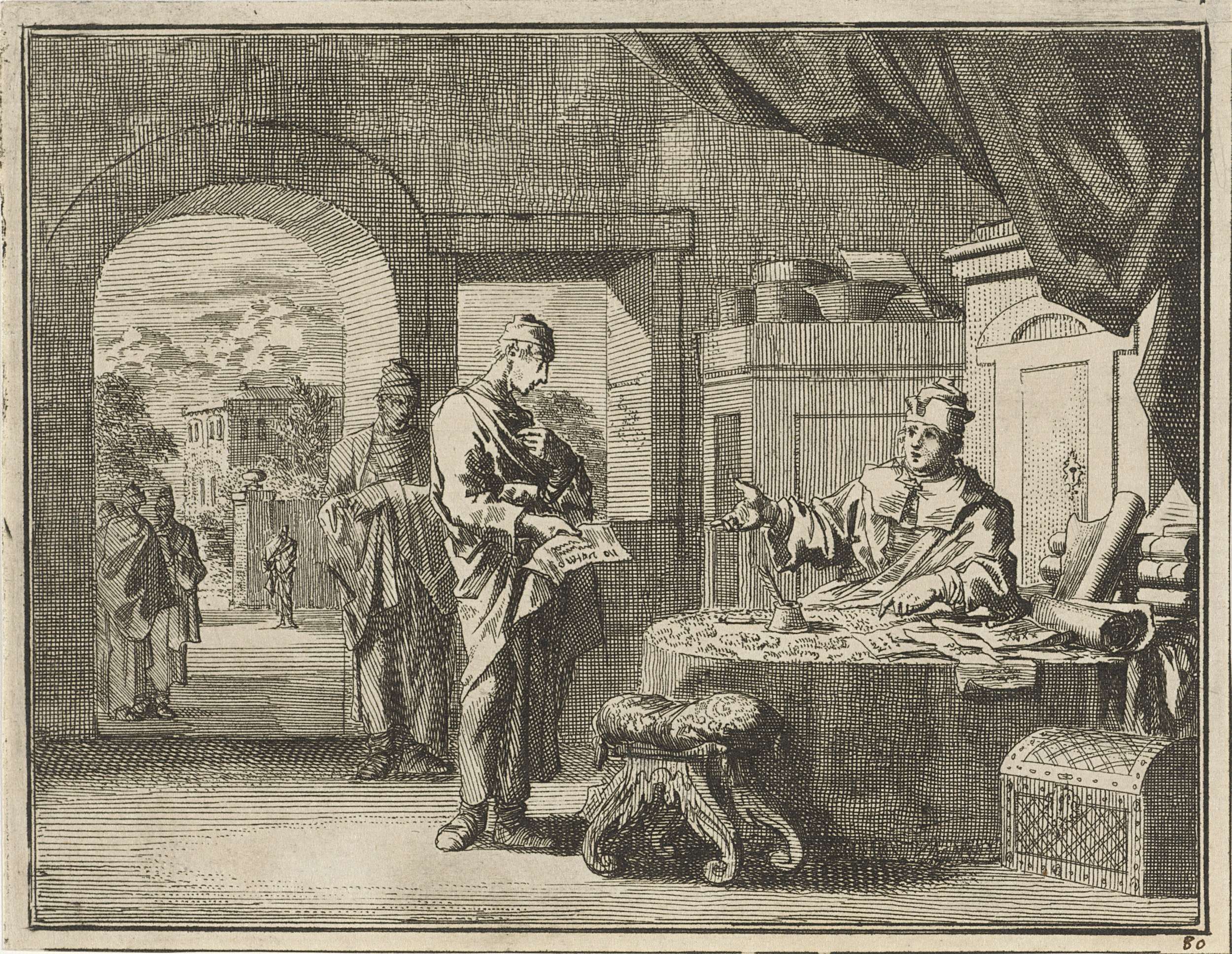 Titelvignet met geleerde schrijvend aan een tafel in...