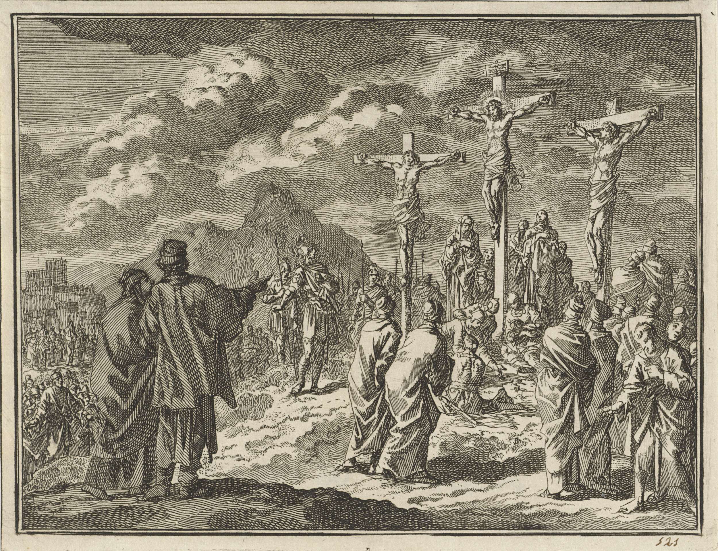 Kruisiging van Christus en allegorie met deugden