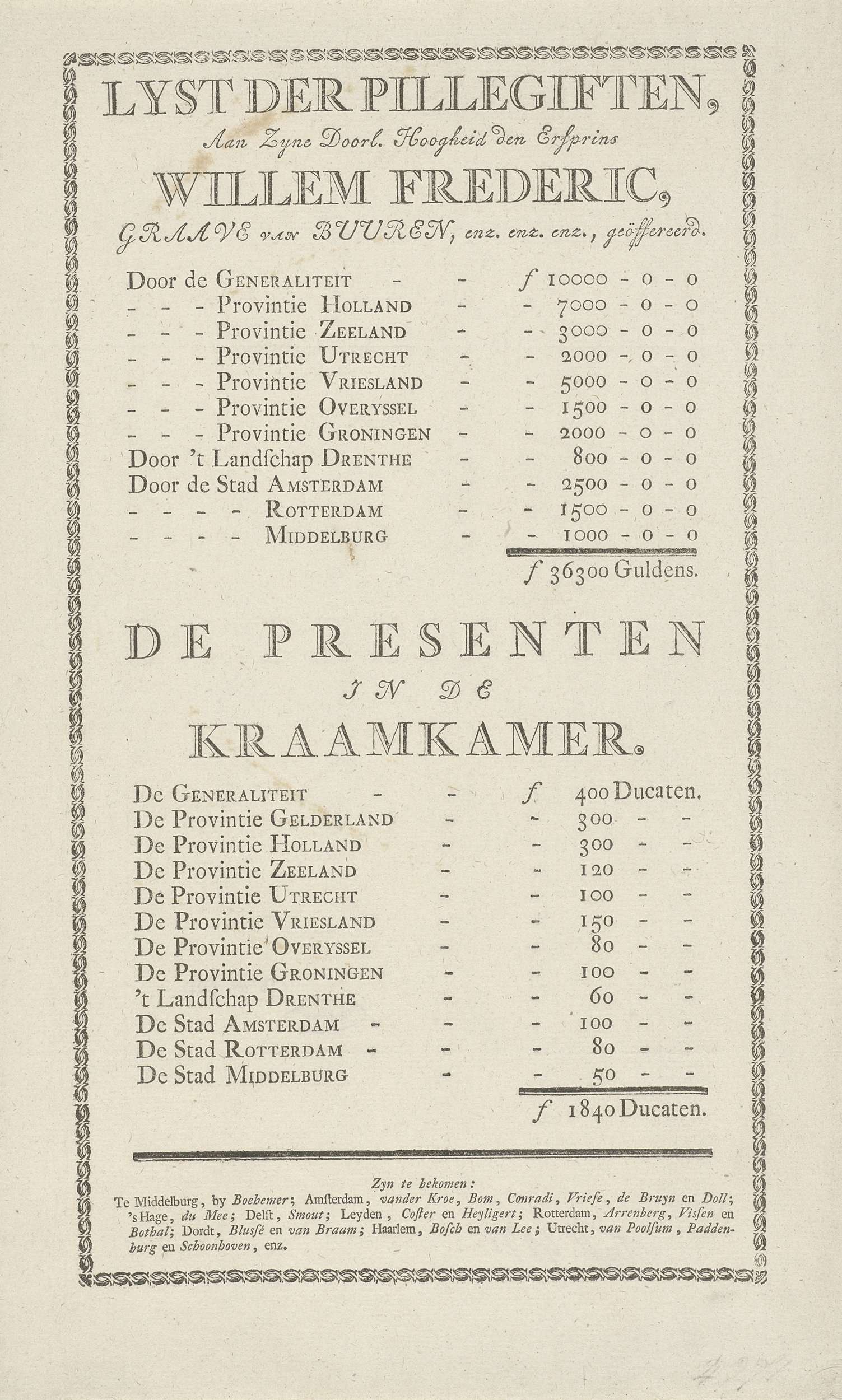 Lijst van pillegiften aan prins Willem Frederik bij ...