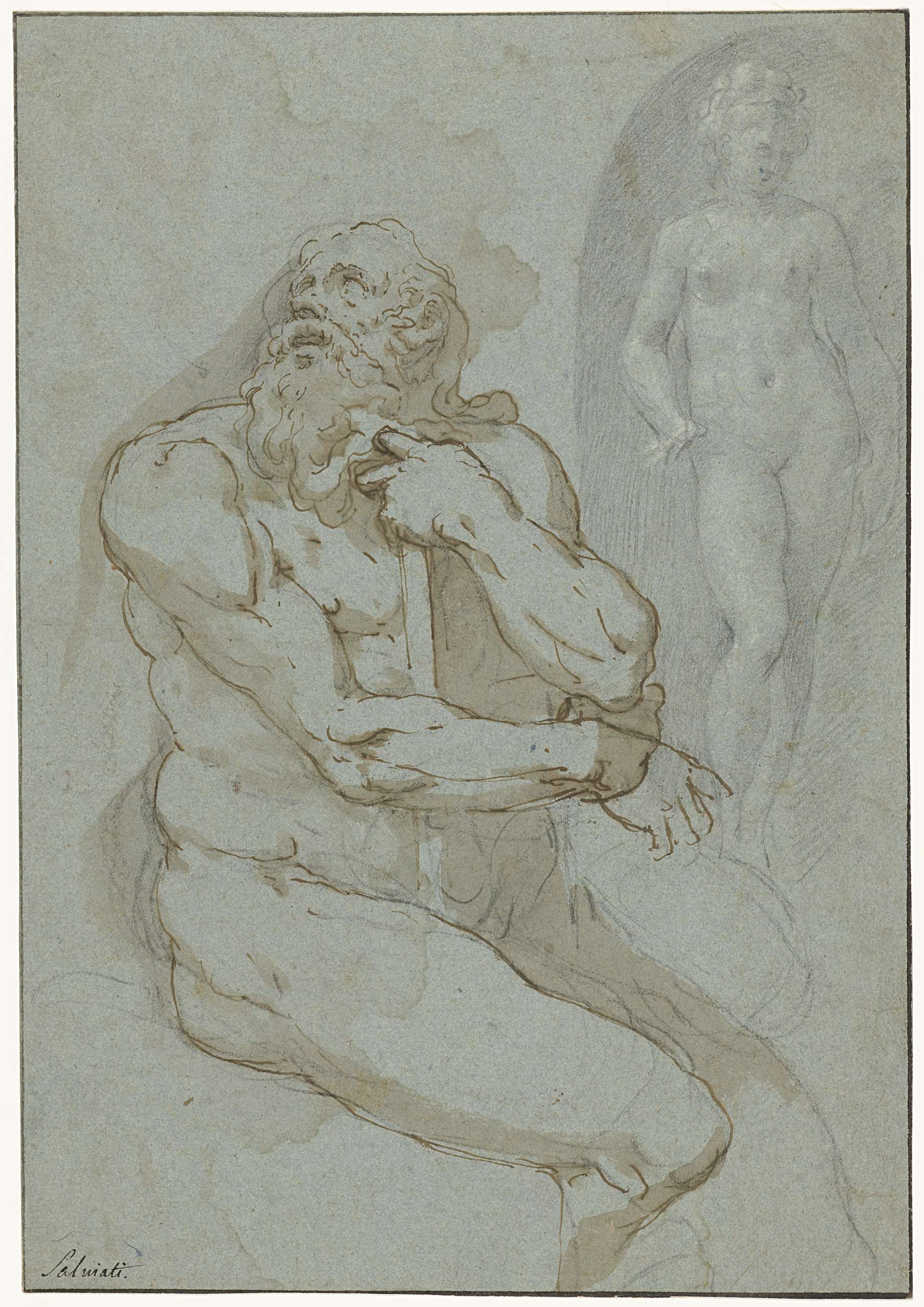 Twee centaurs, een bok, een boom en twee mensfiguren