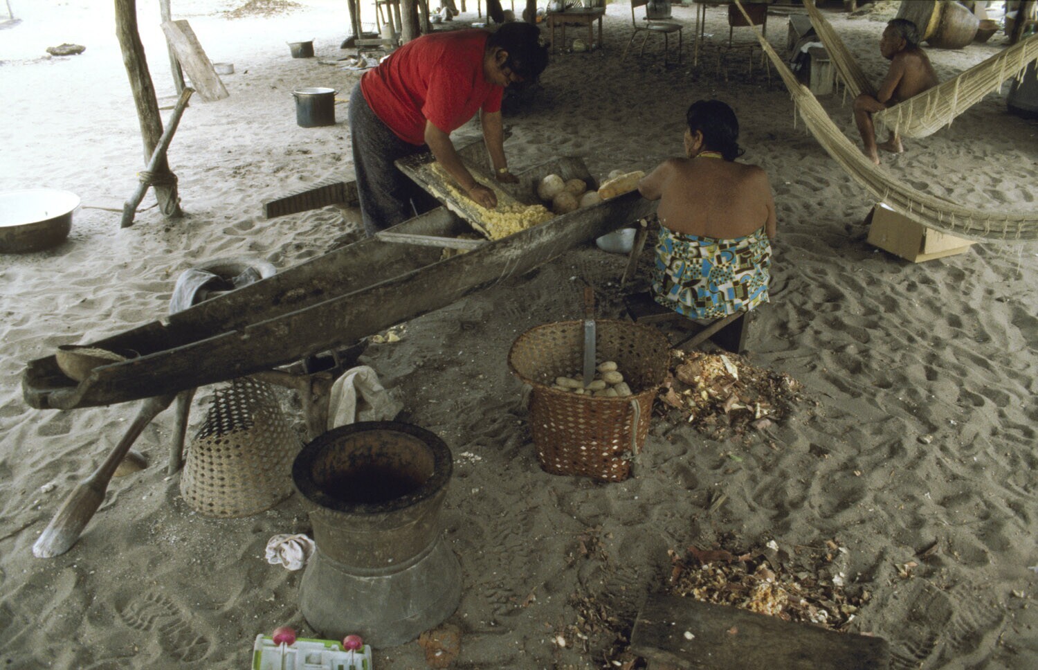 Galibi, Marowijnerivier; vrouw bezig met bereiding c...