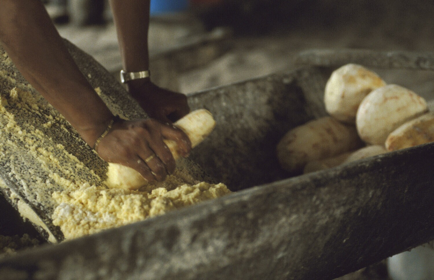 Galibi, Marowijnerivier; vrouw raspt cassave (gebrui...