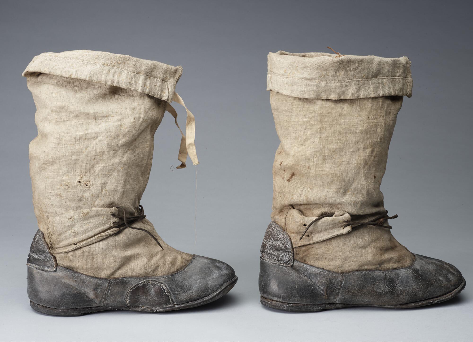 Een paar zeildoeken laarzen, gedragen door Henri Eka...