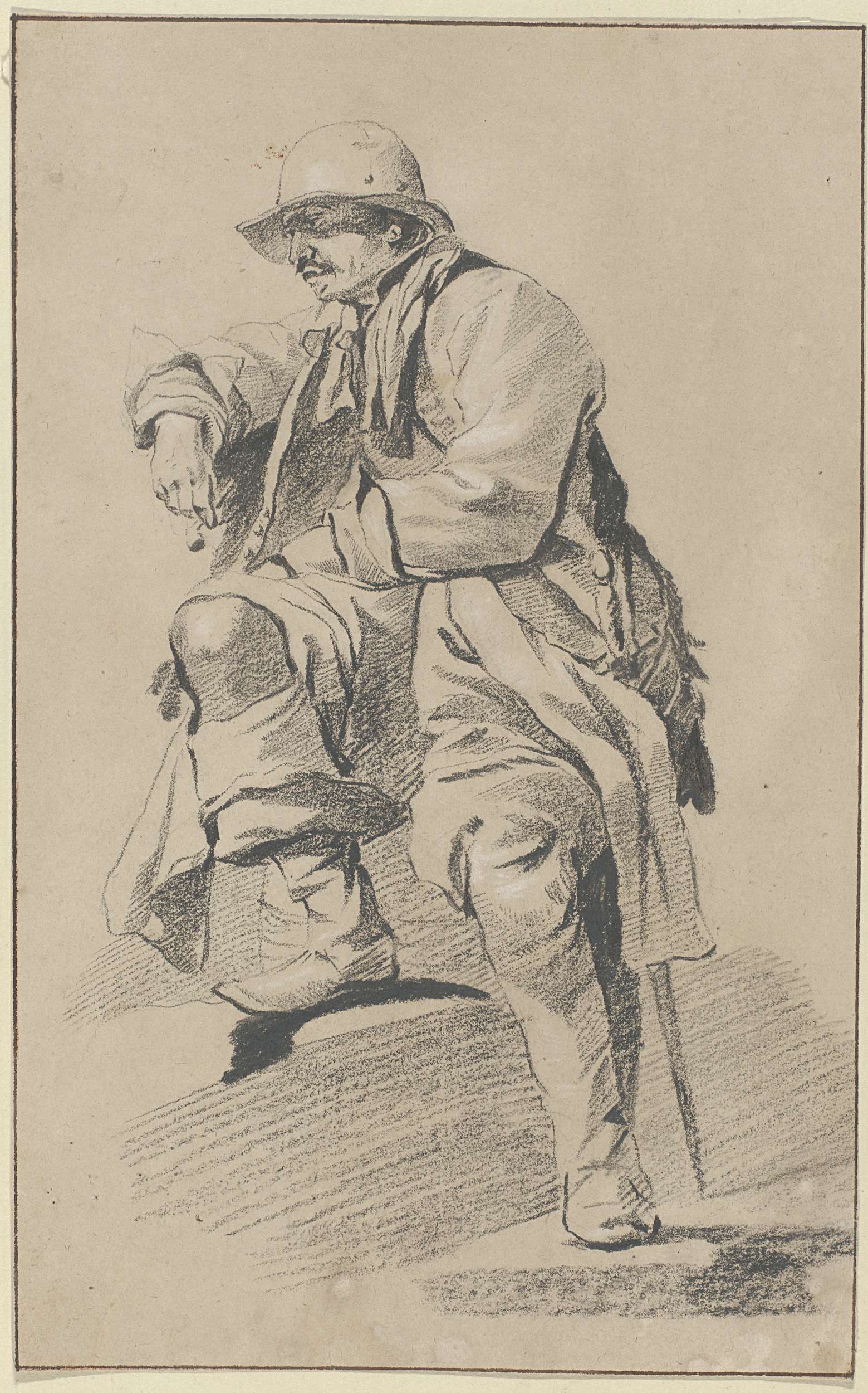 Zittende man, naar links gewend, met hoed, snor, sab...