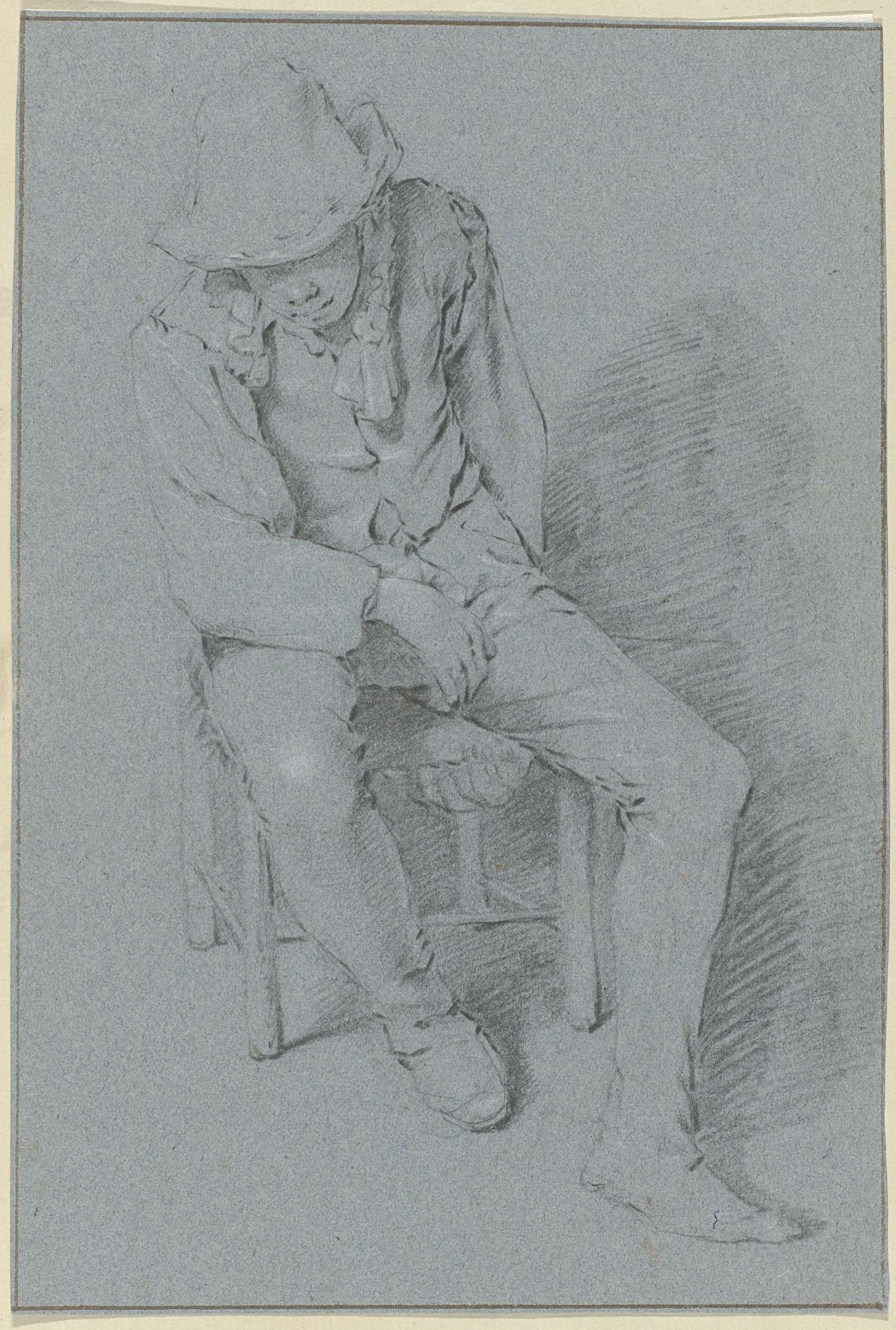 Zittende naakte man, zijn hoofd met zijn hand onders...