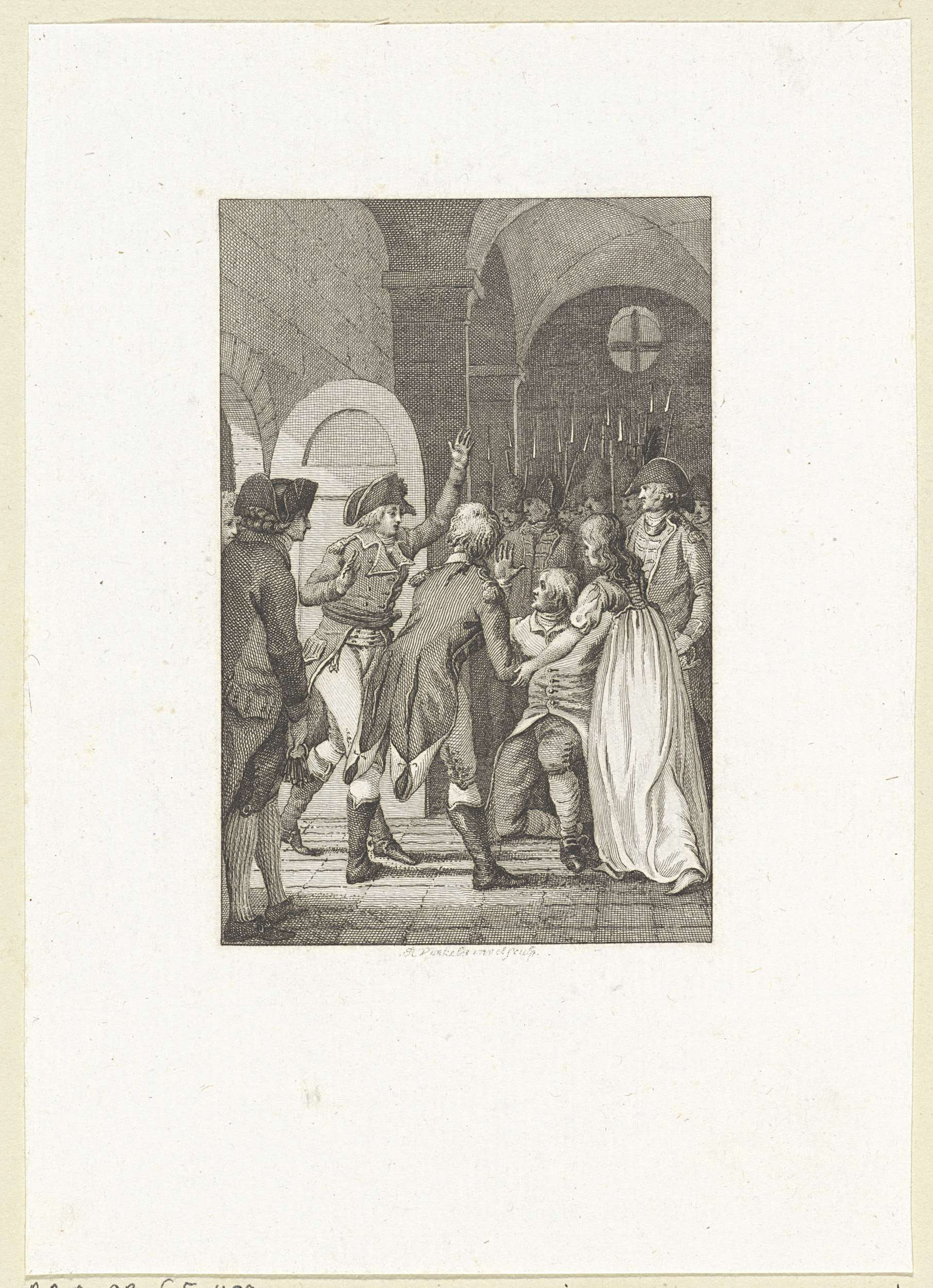 Geknielde man met een vrouw te midden van soldaten