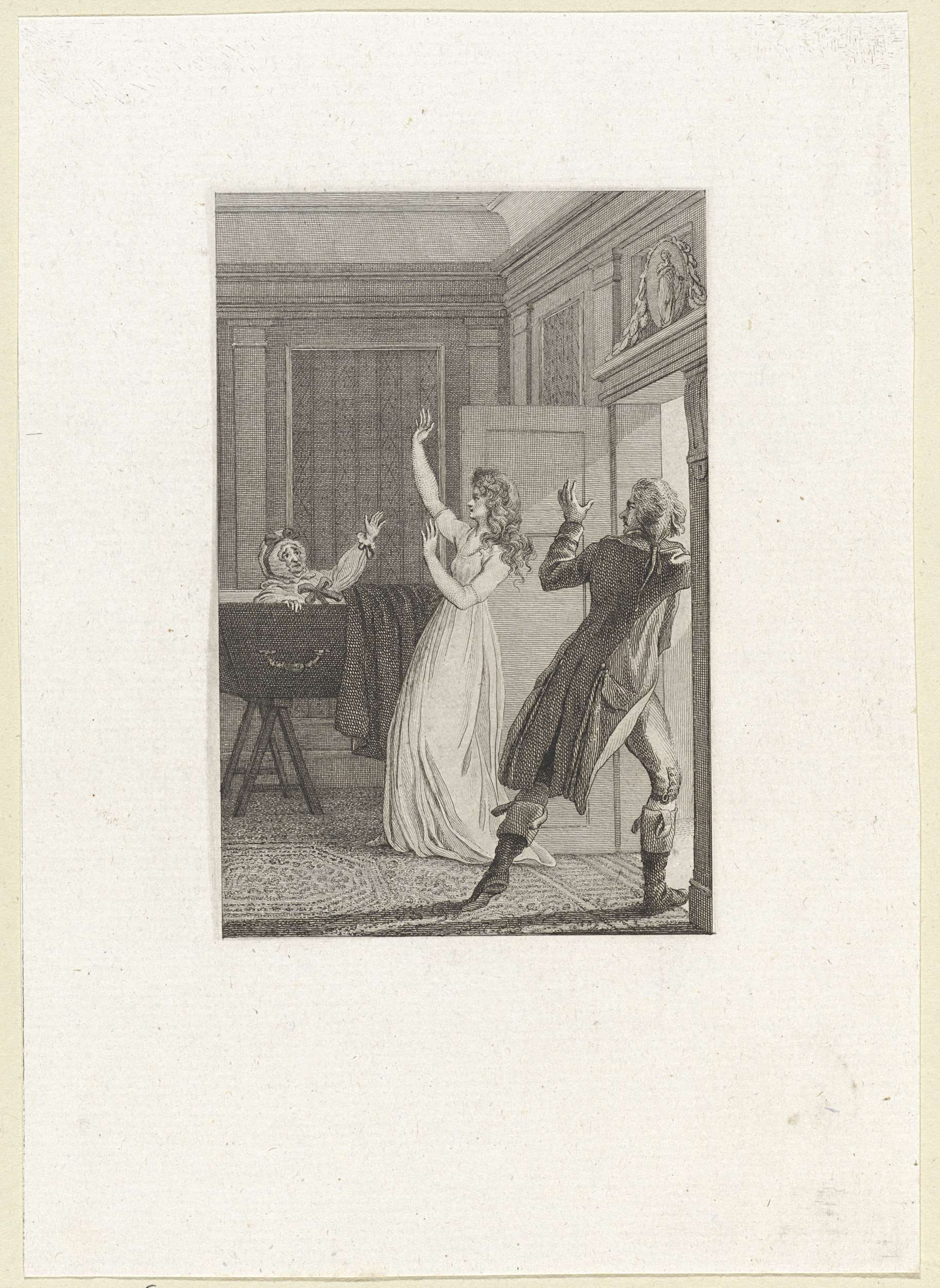 Vrouw verlaat een vertrek terwijl een man toekijkt