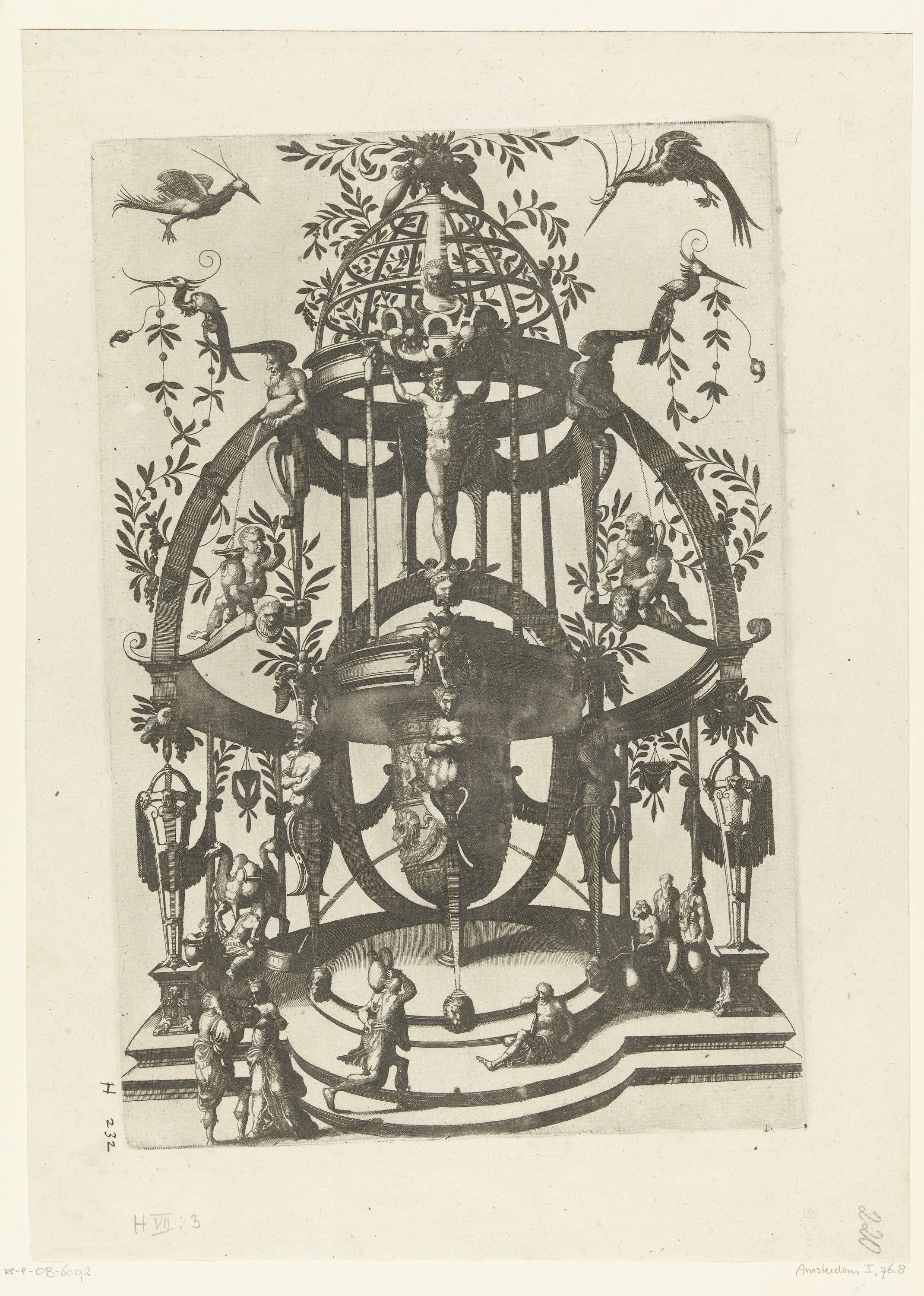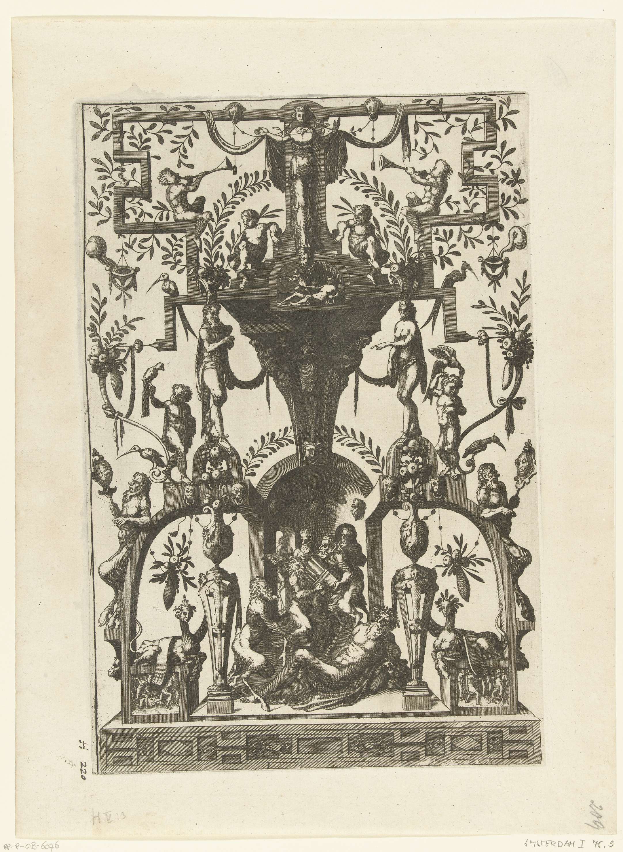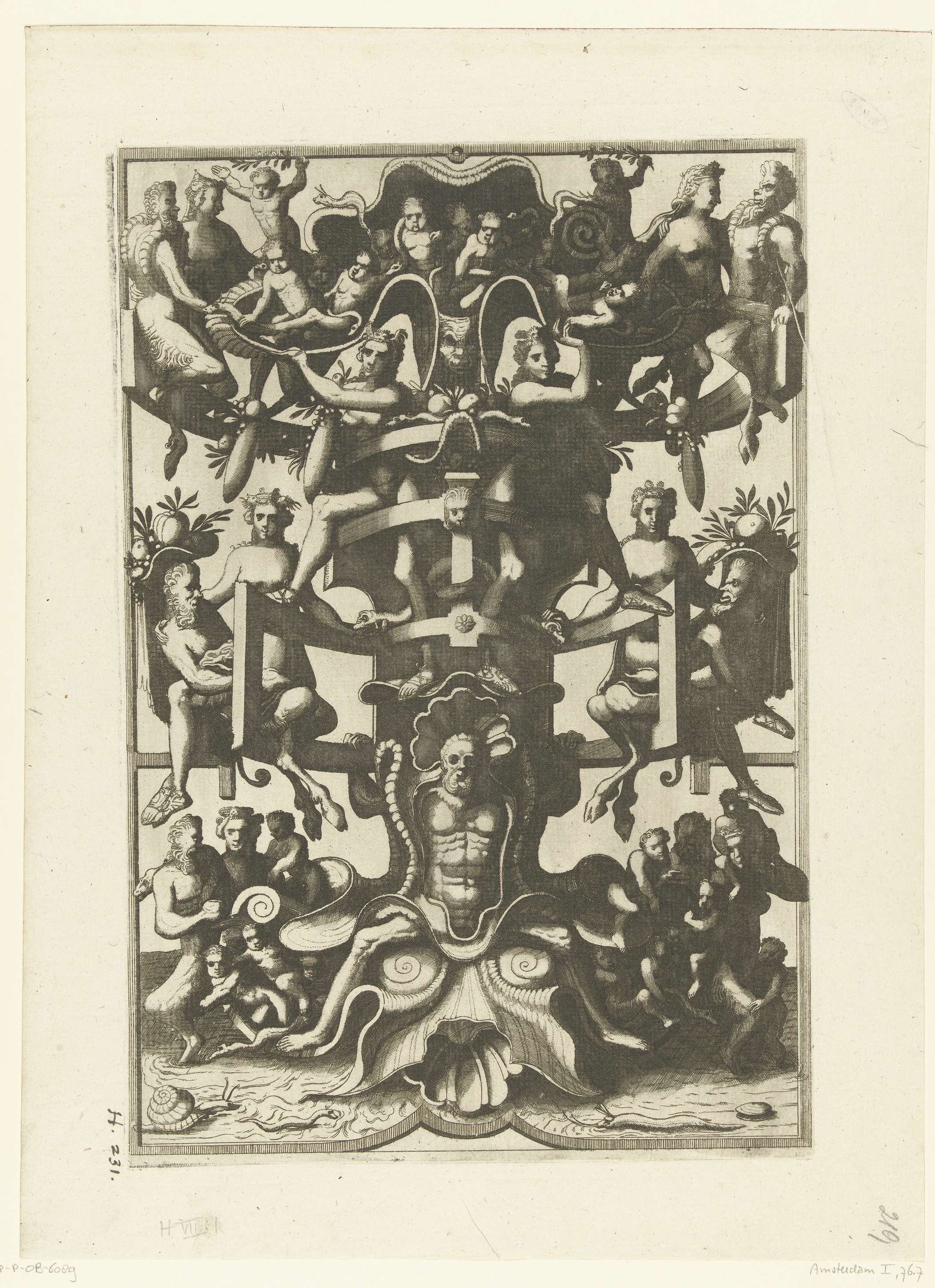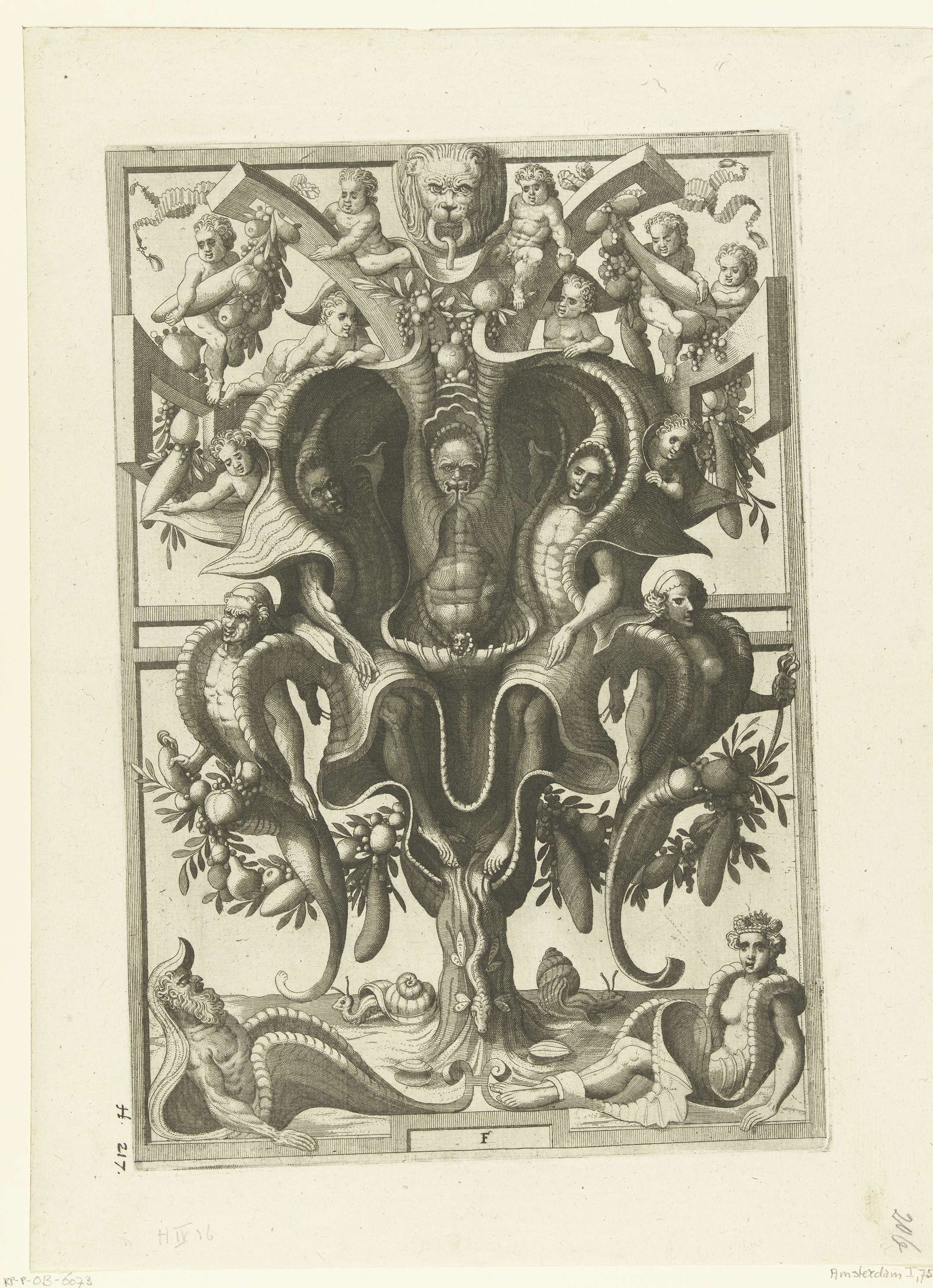 Schelpachtig ornament waarin figuren gevangen zitten.