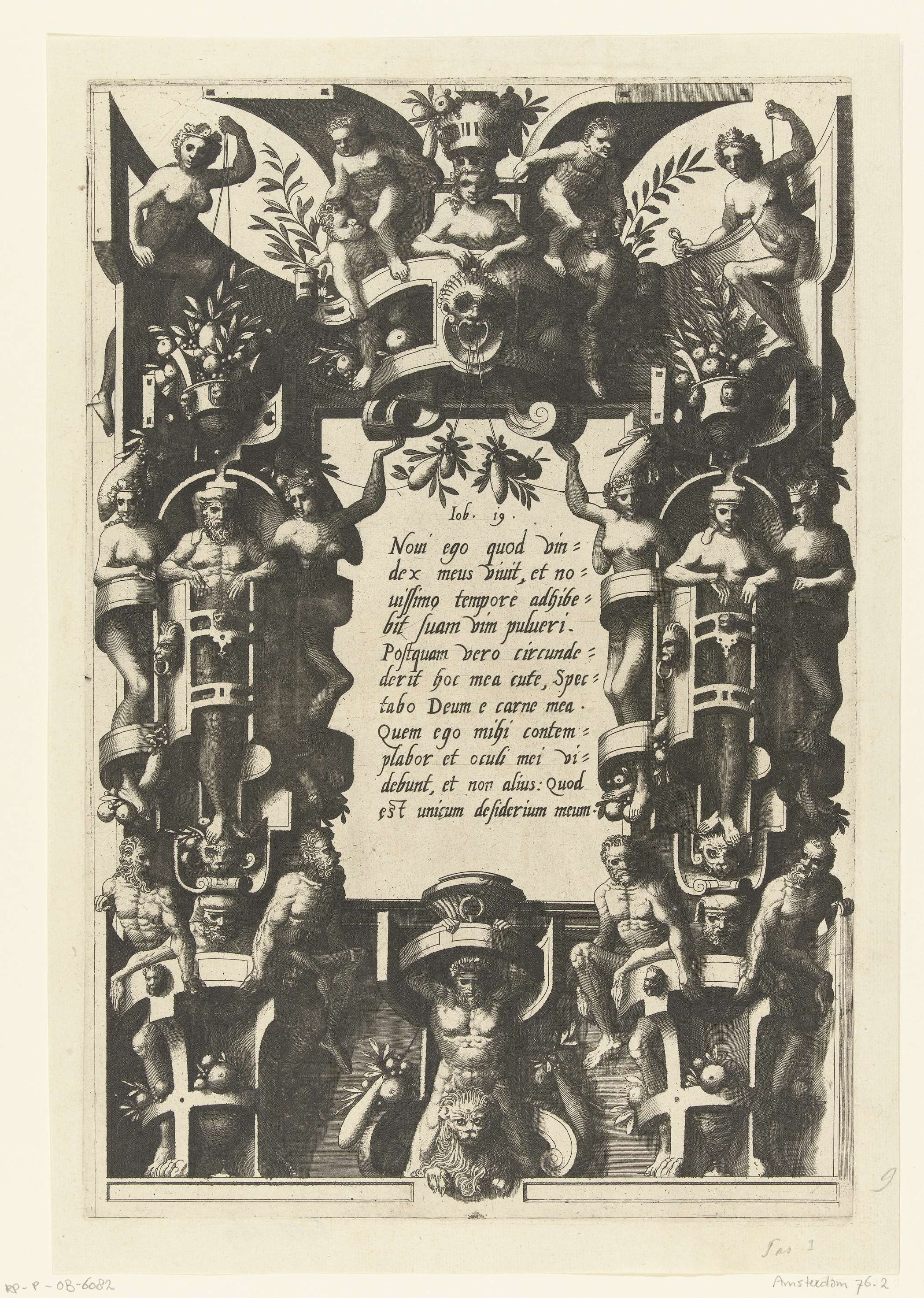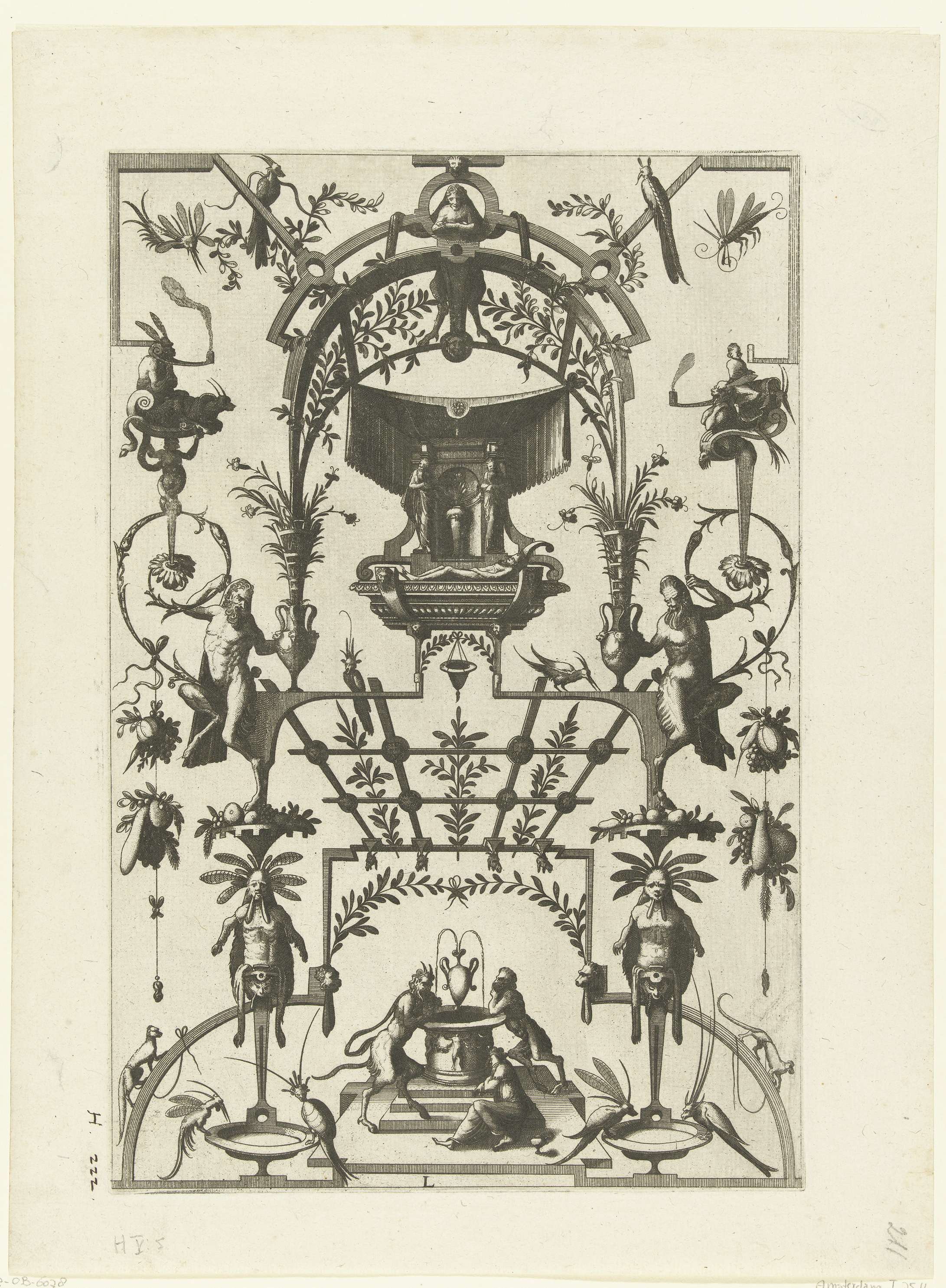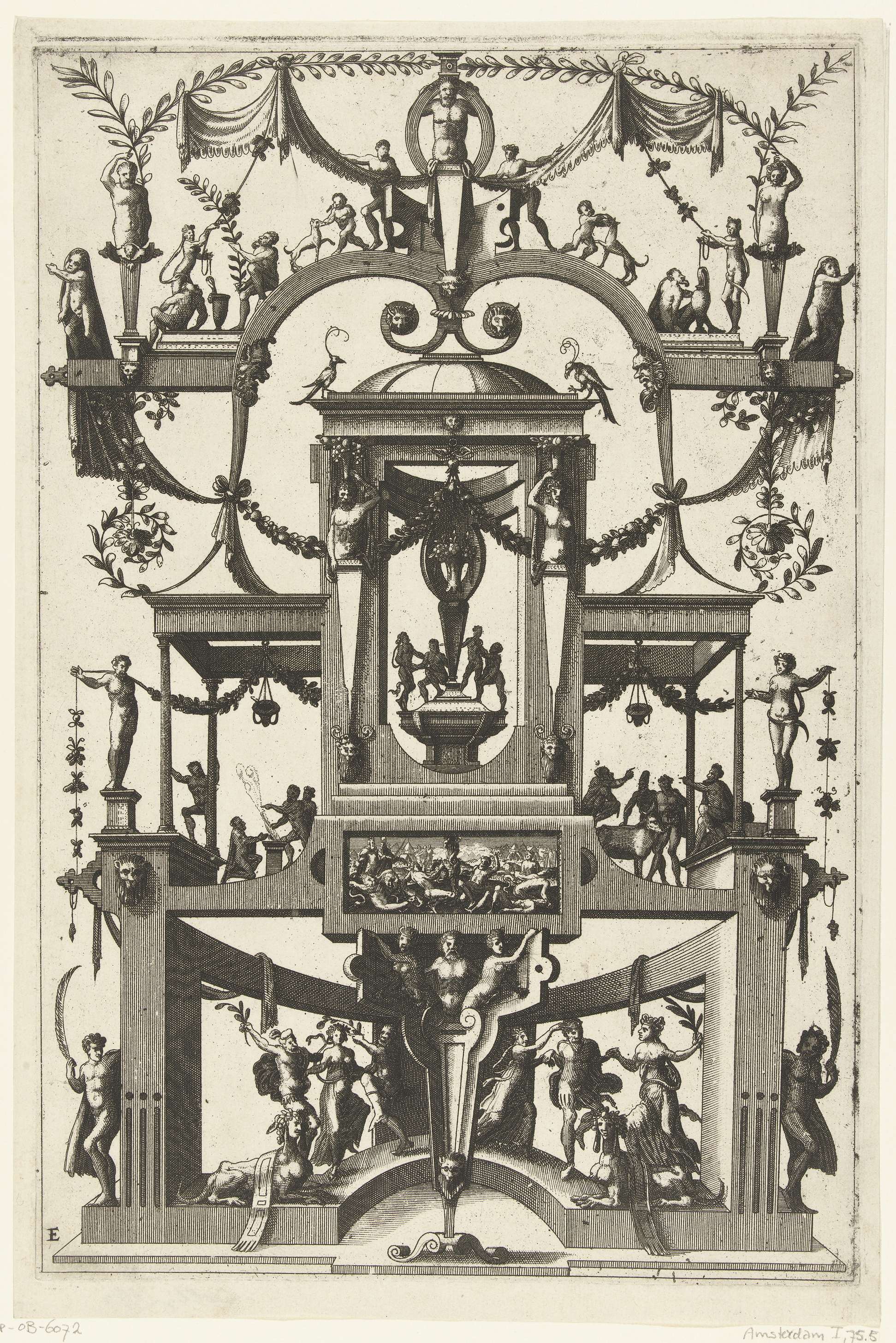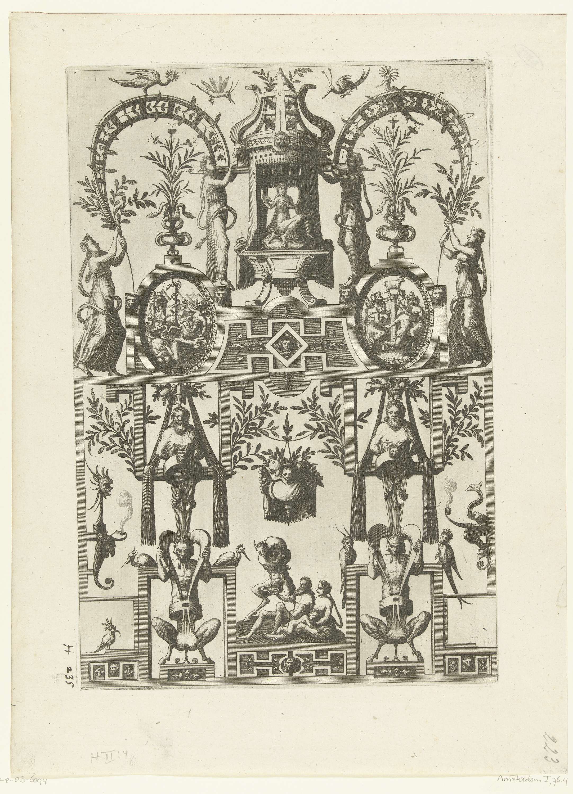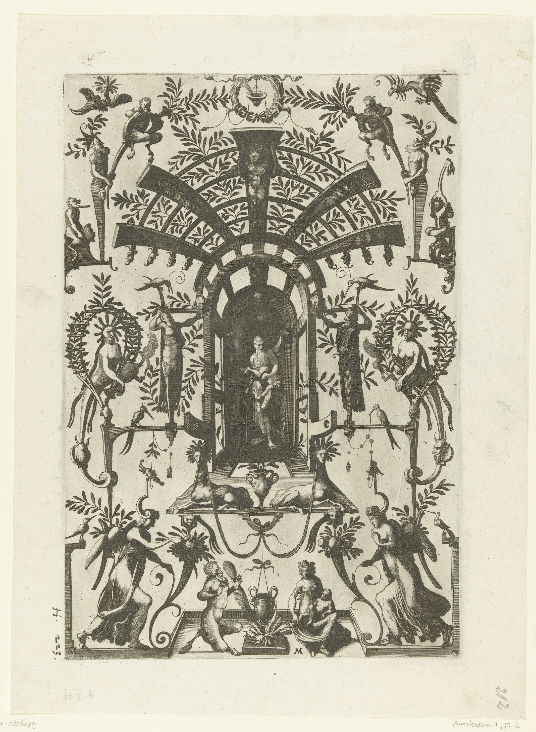 Schelpachtig ornament waarin figuren gevangen zitten.
