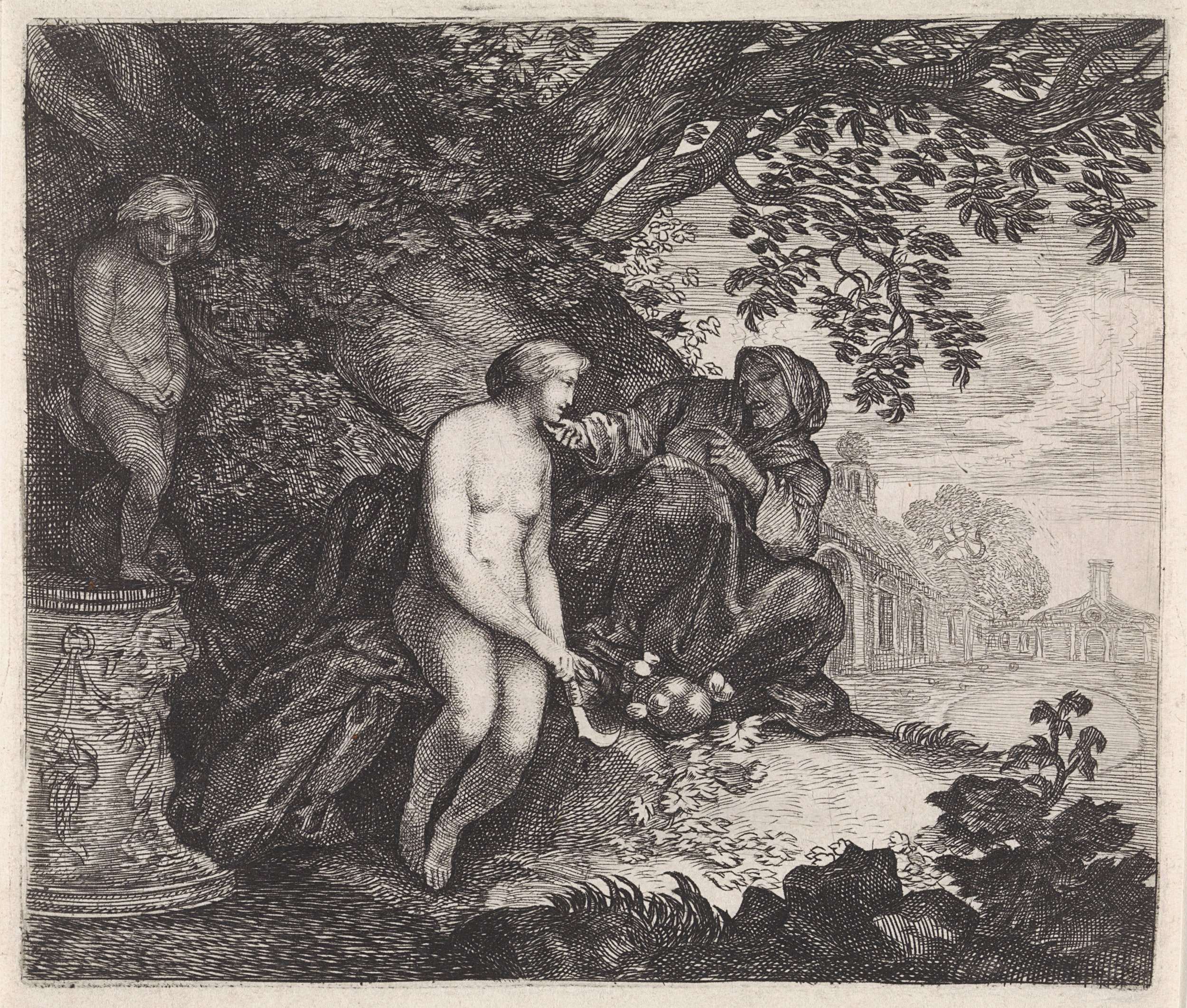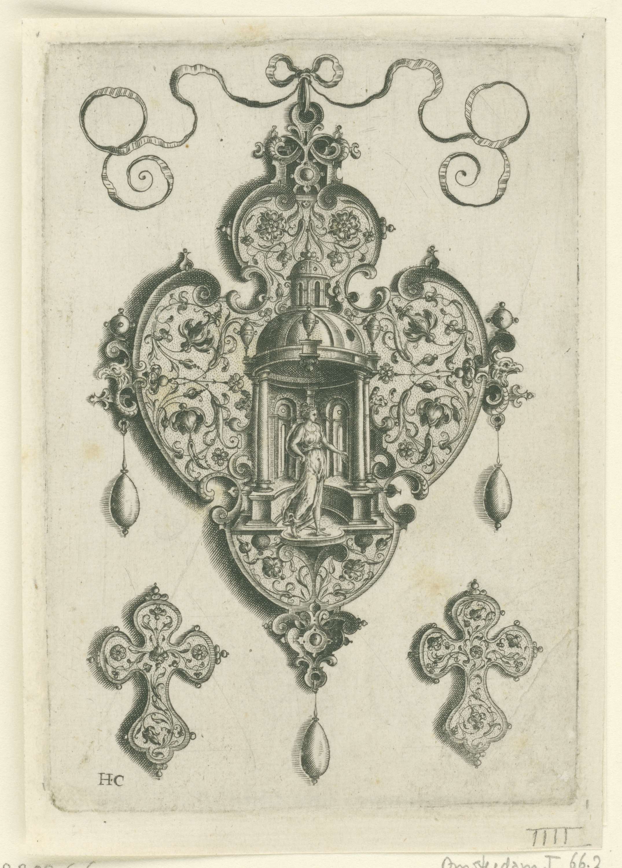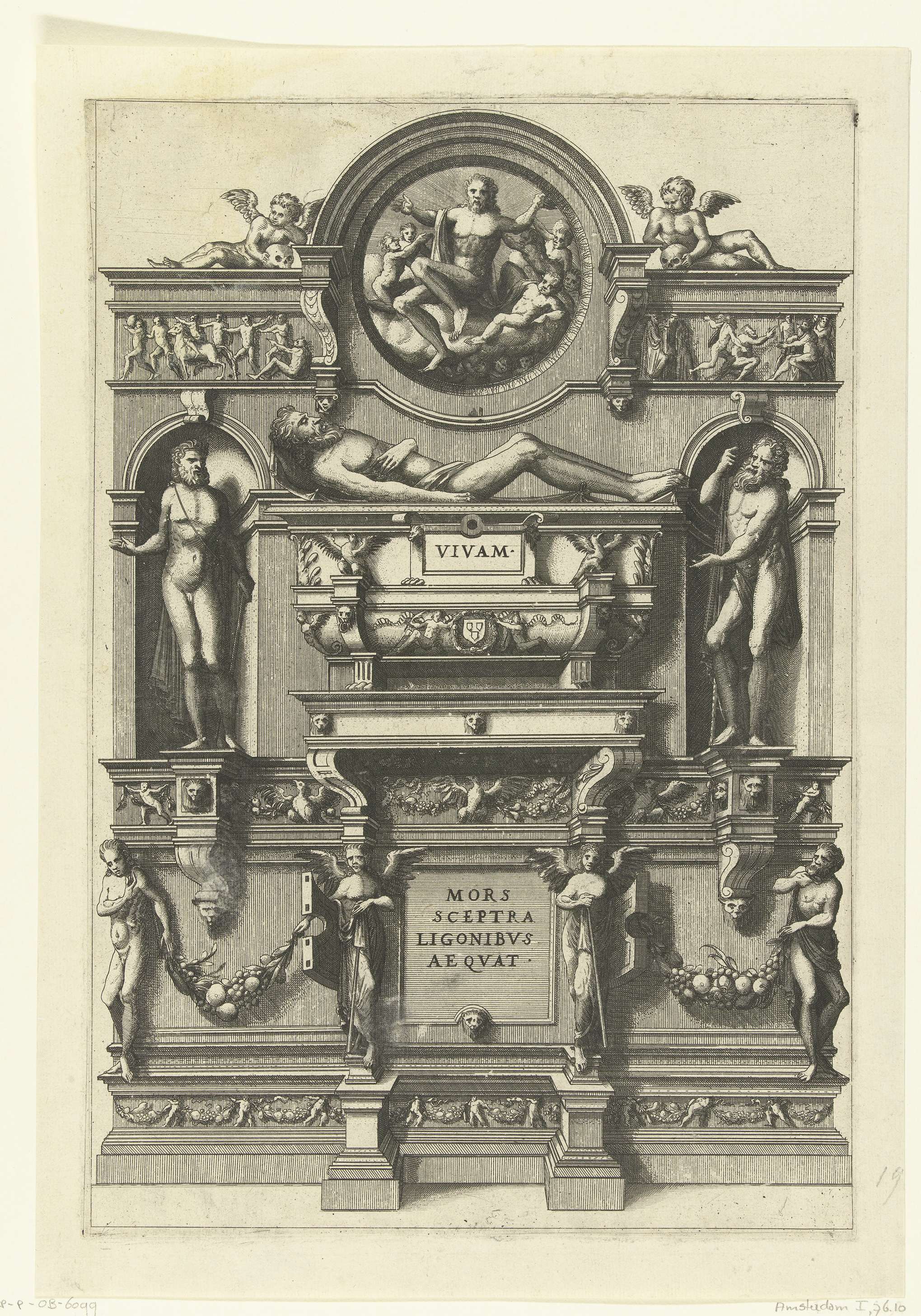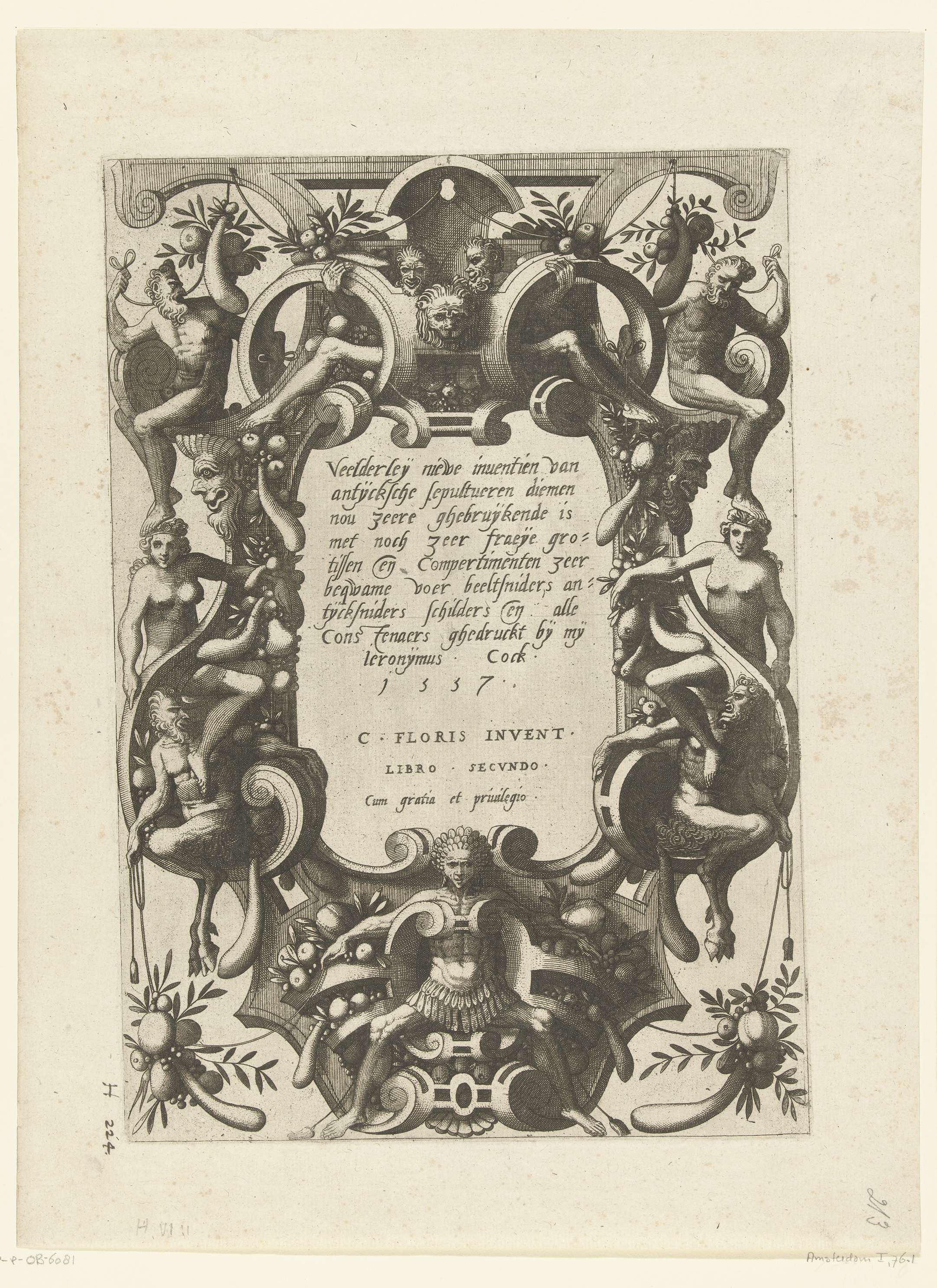 Schelpachtig ornament waarin figuren gevangen zitten.