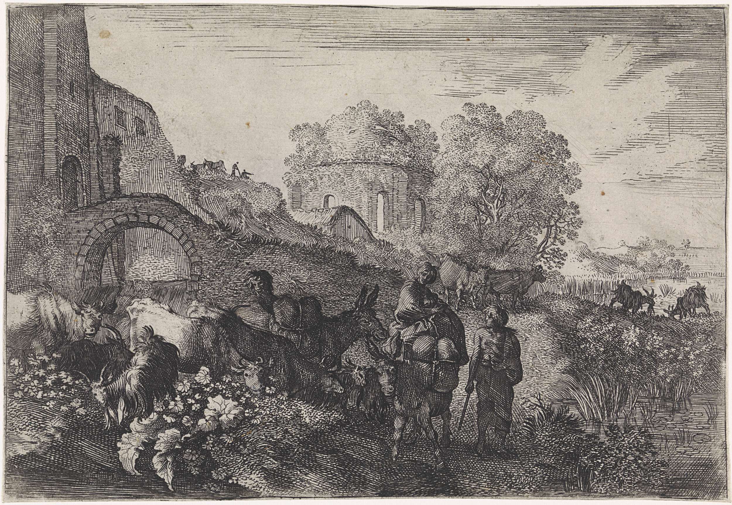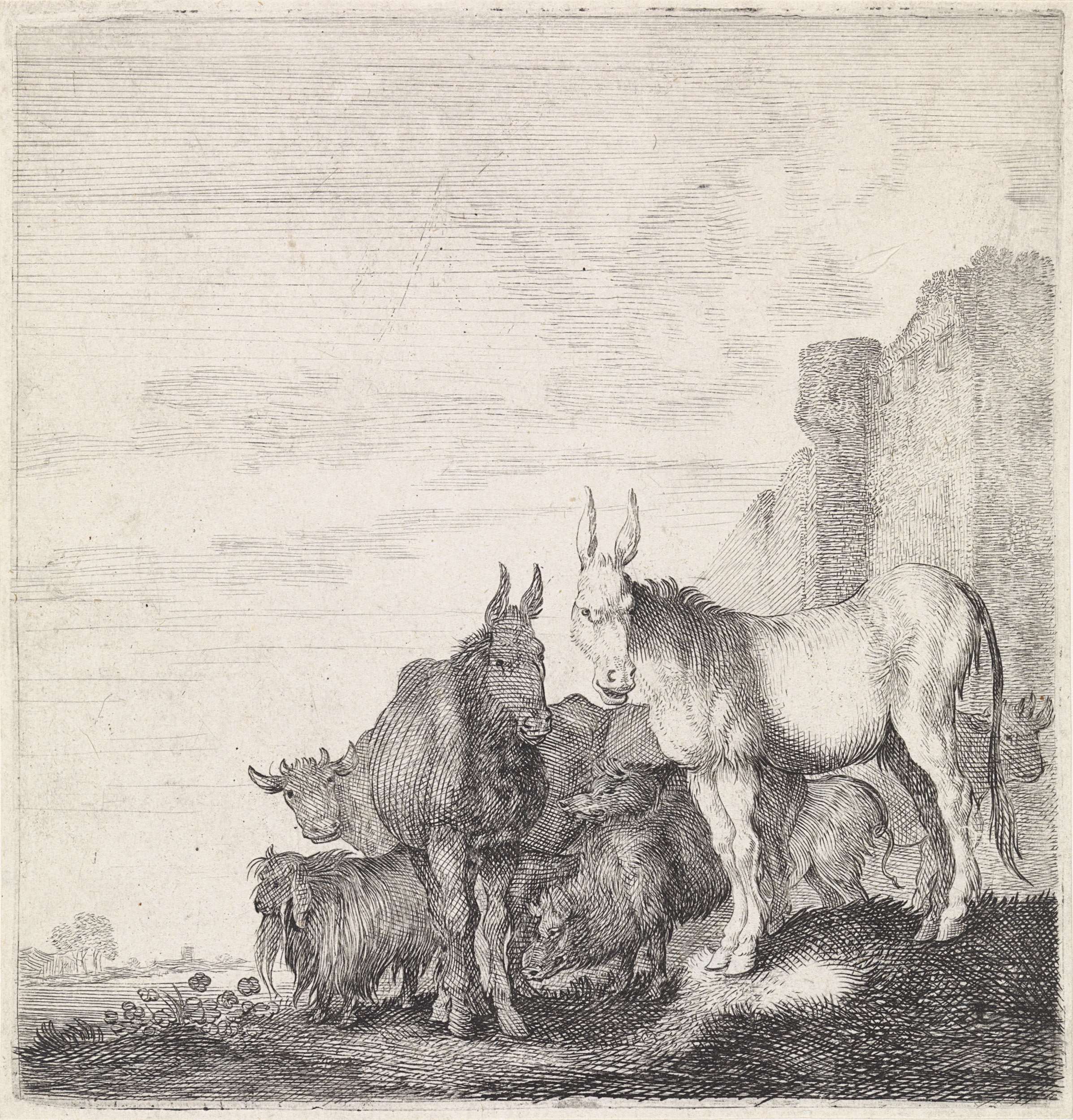 Twee paarden met geiten en een koe bij een hoge (sta...