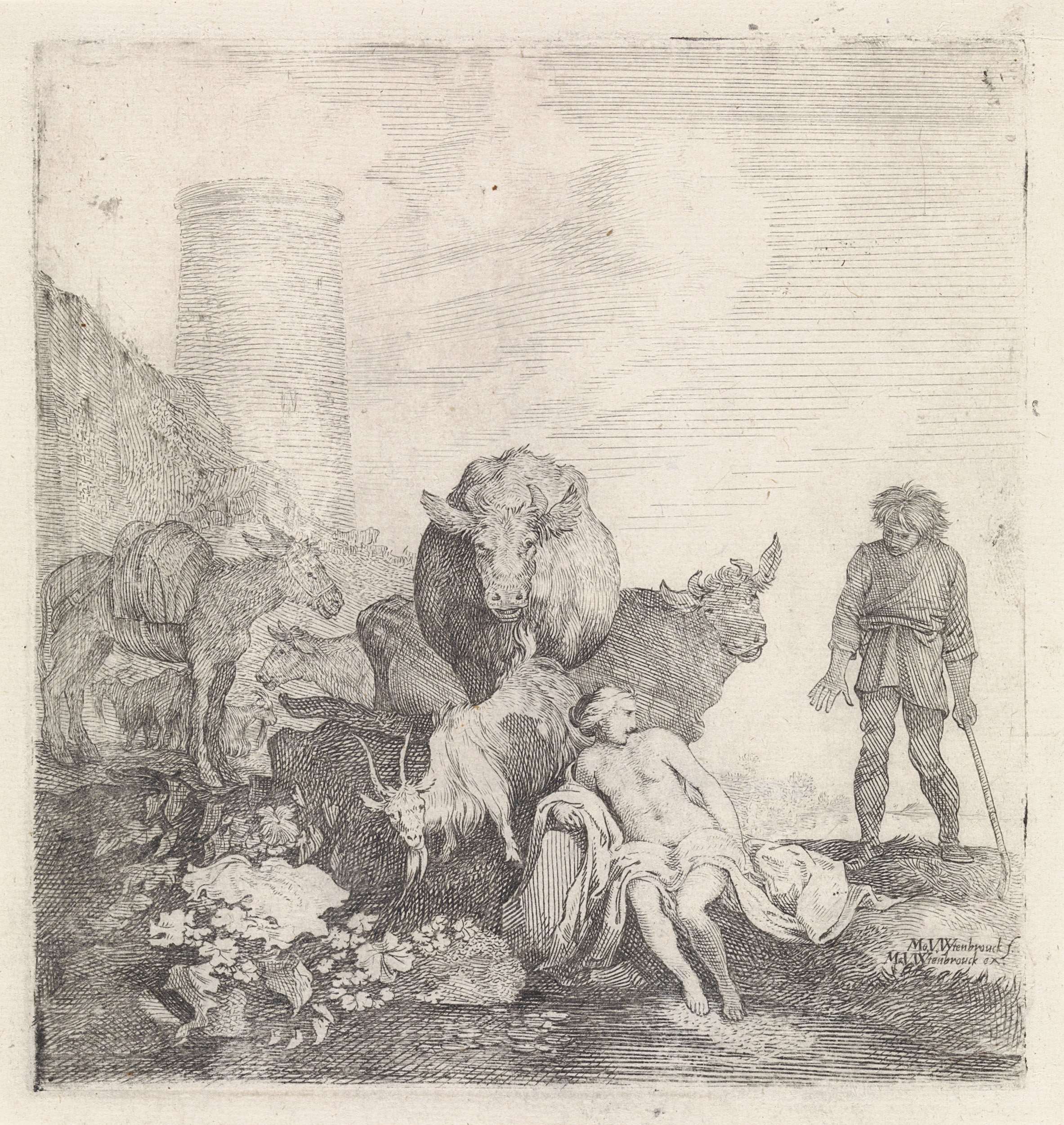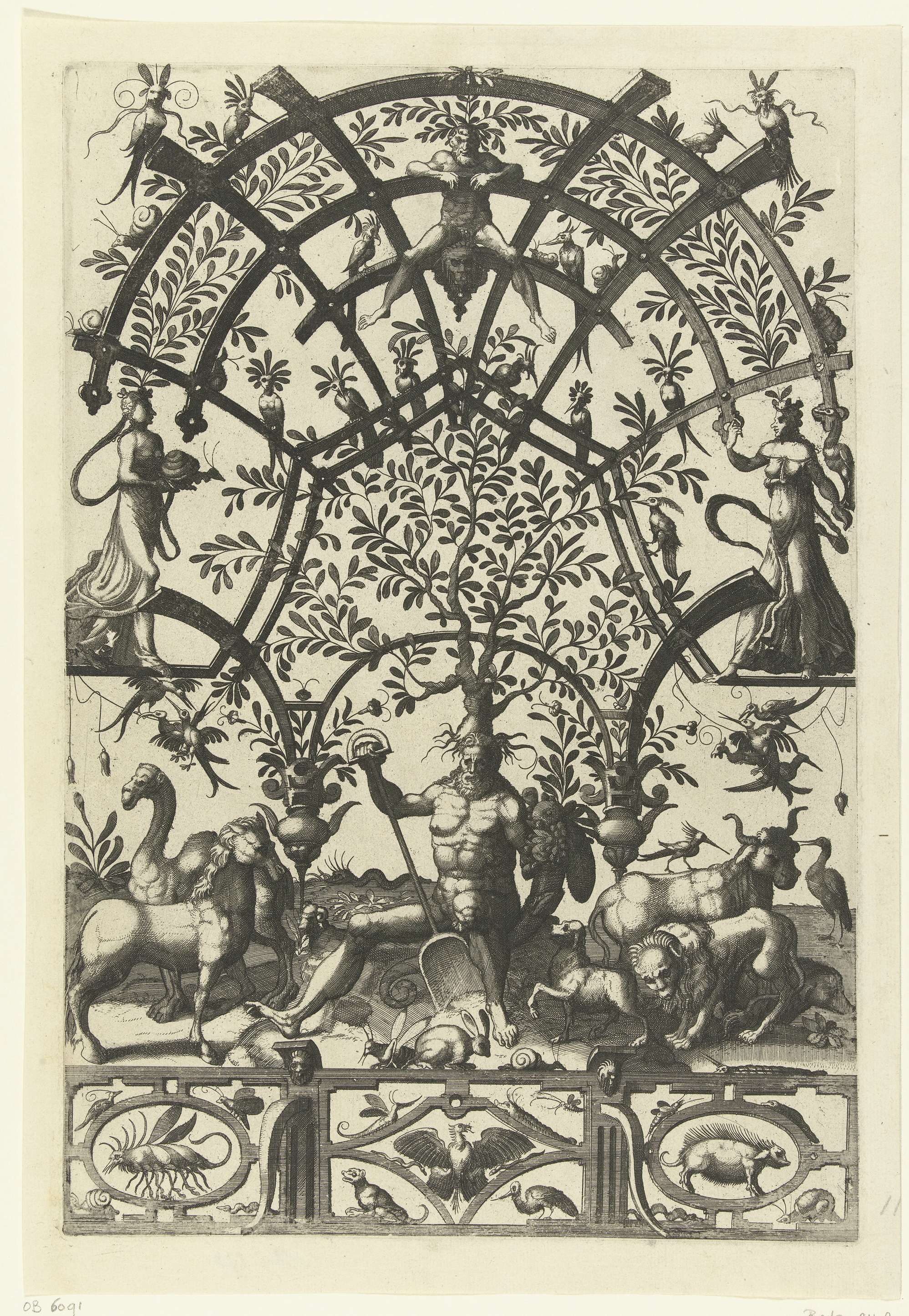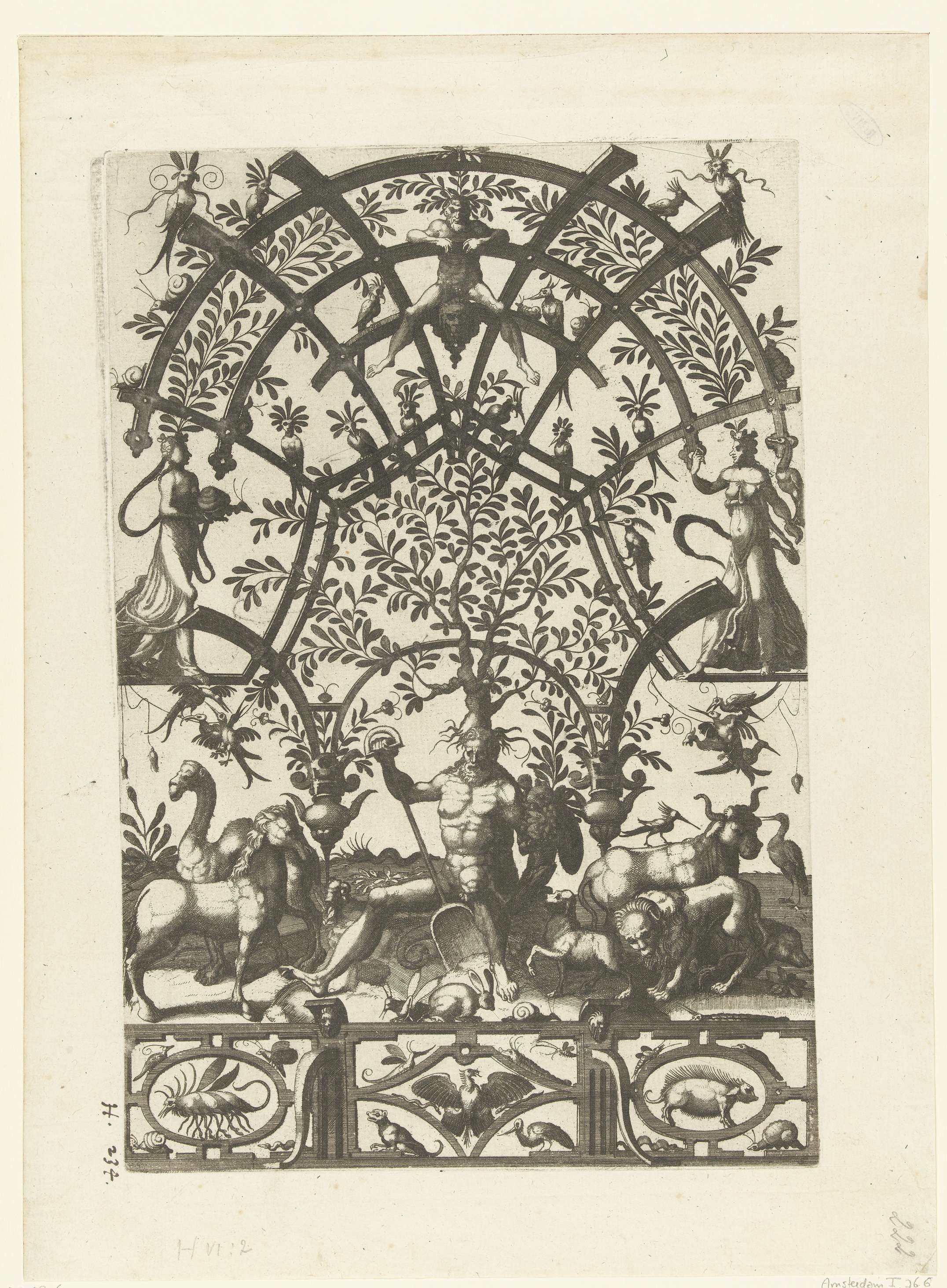 Voor een nis met zijbogen ligt Bacchus, omringd door...