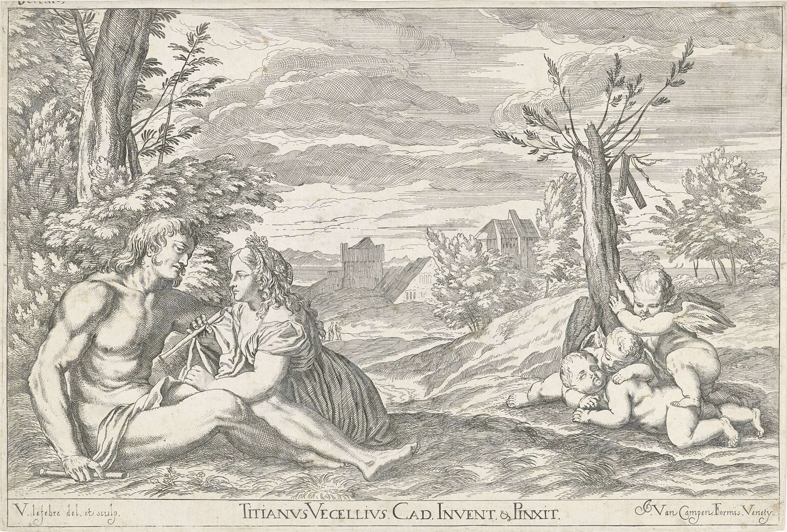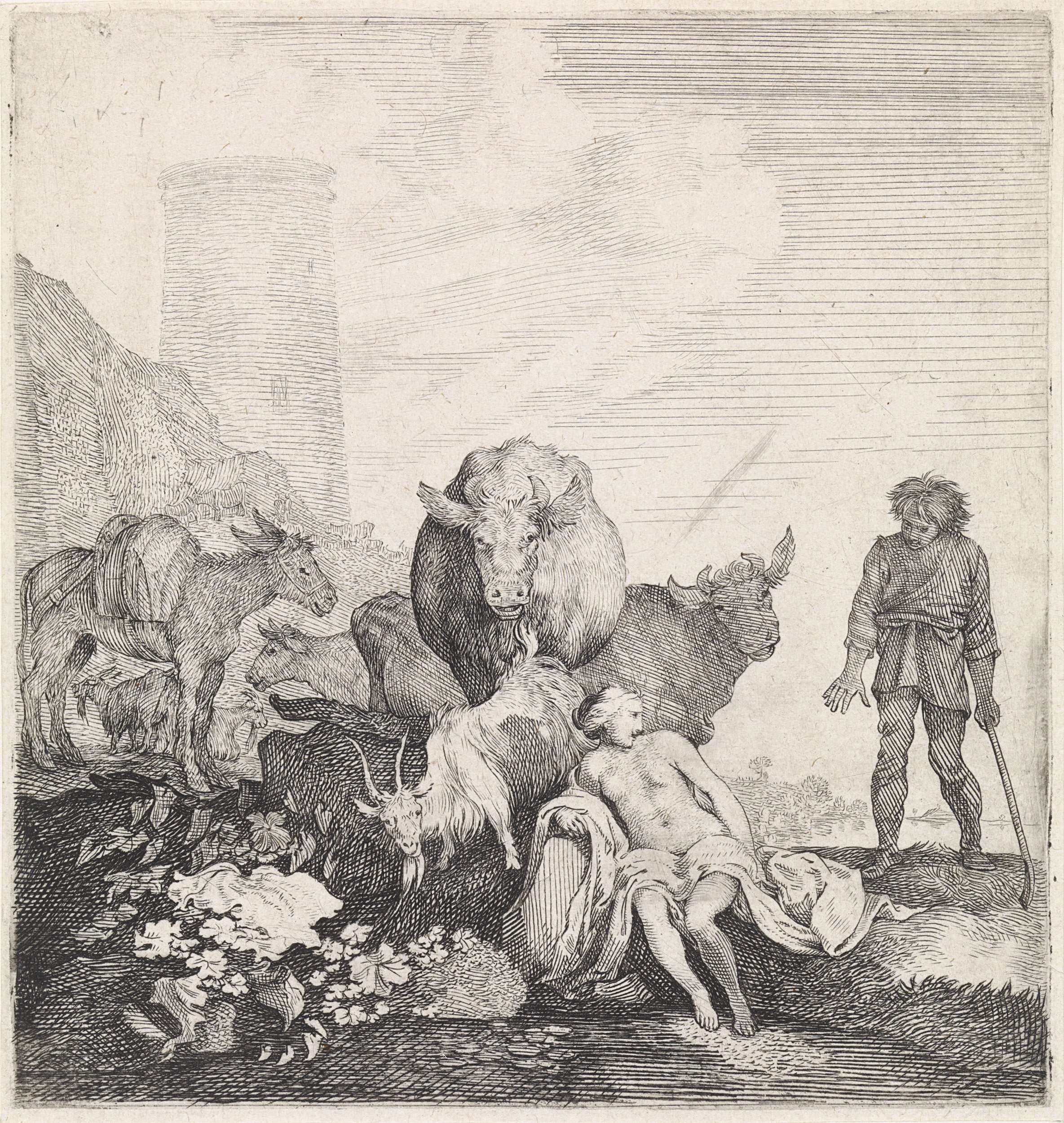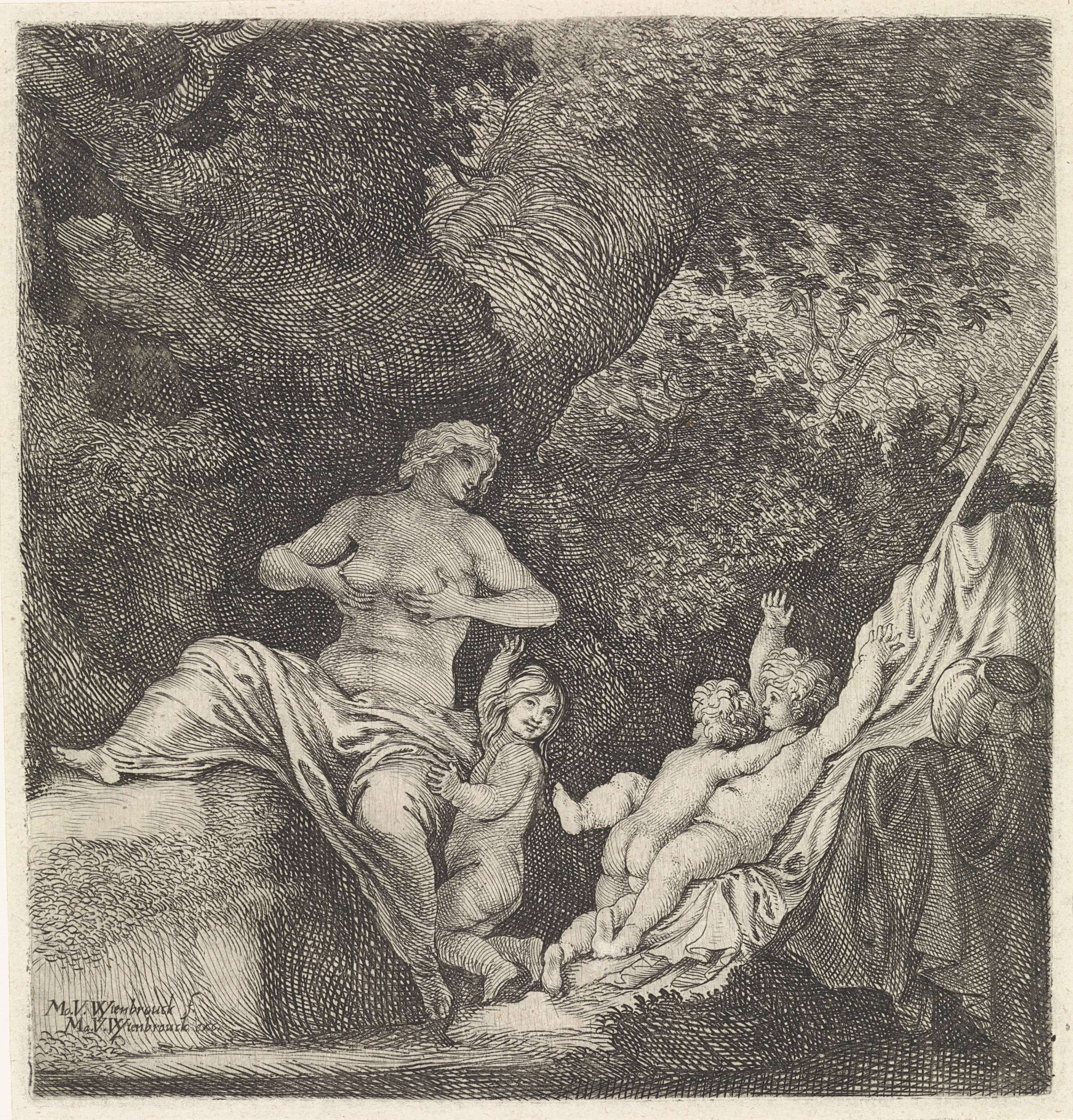 Voor een nis met zijbogen ligt Bacchus, omringd door...