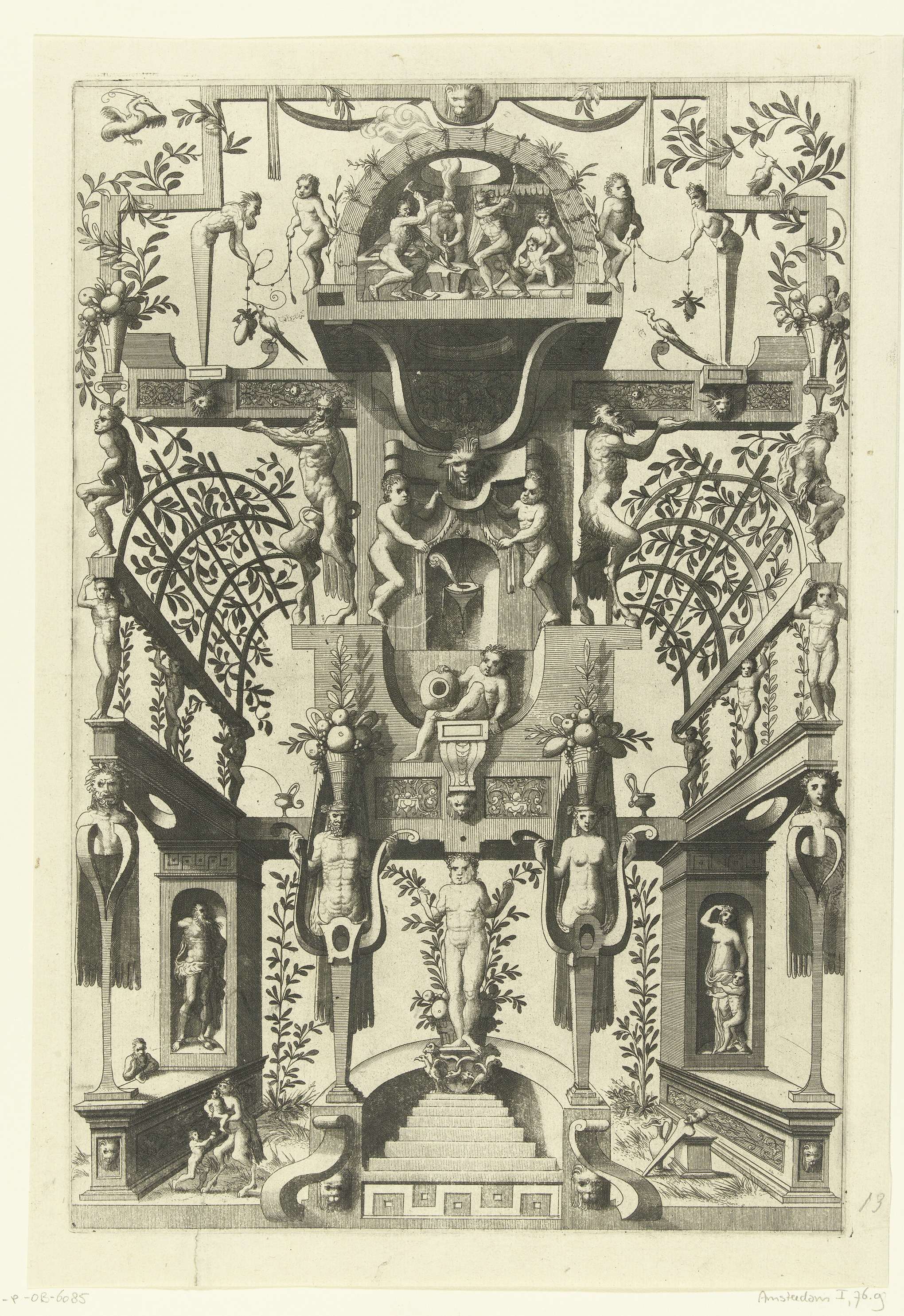Nis op sokkel onder pergola, in het midden Laocoön.