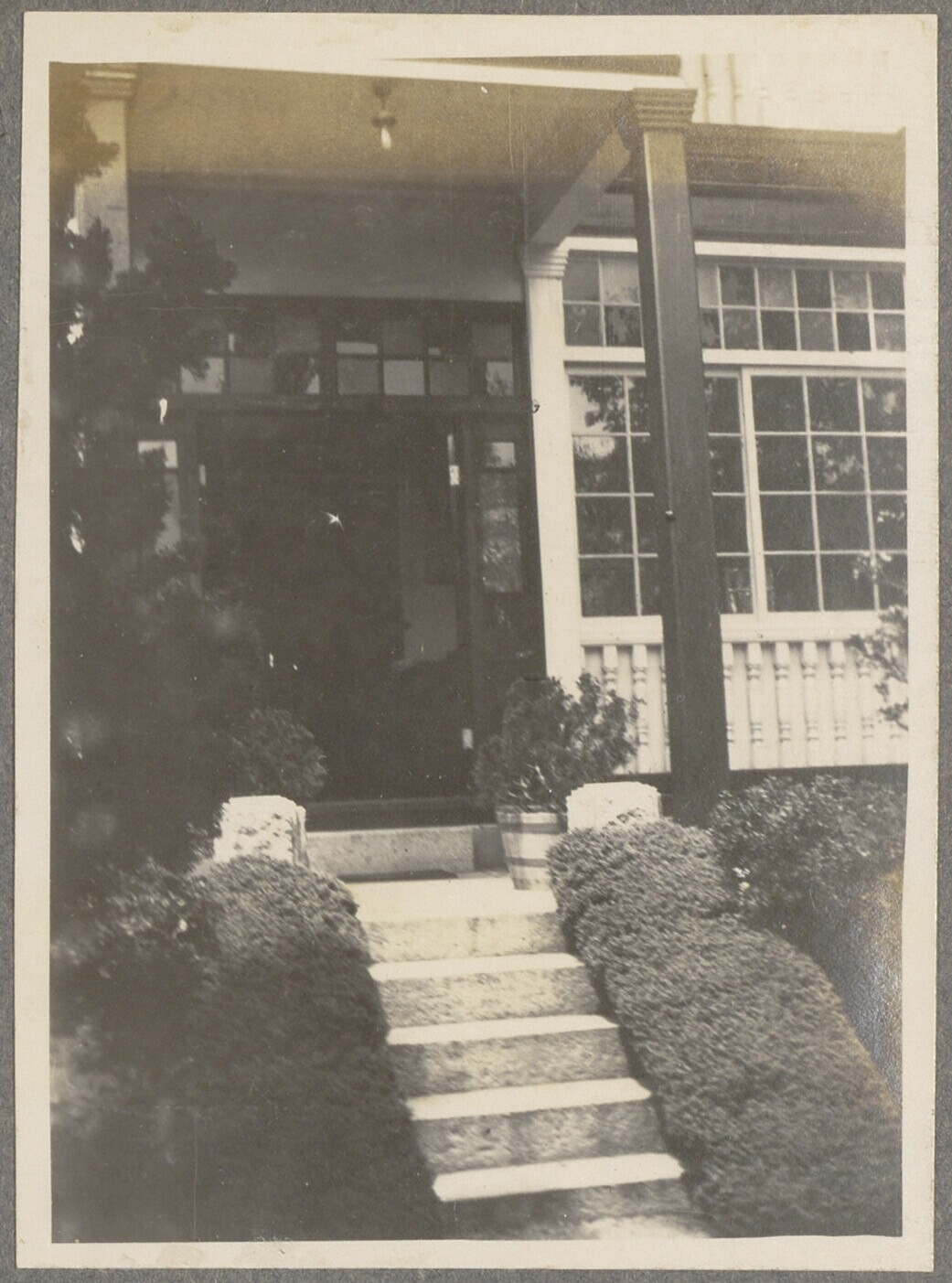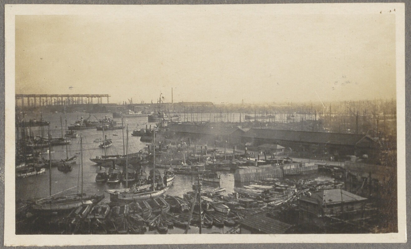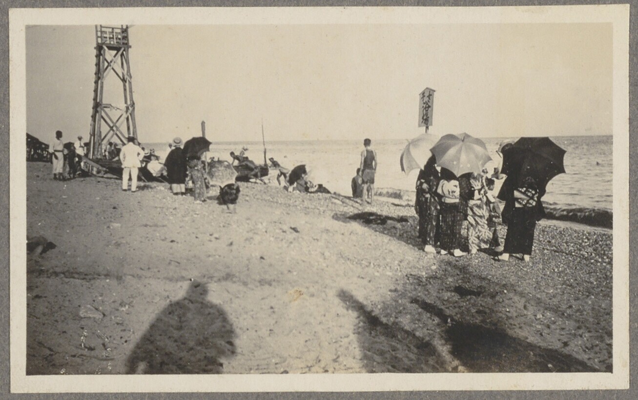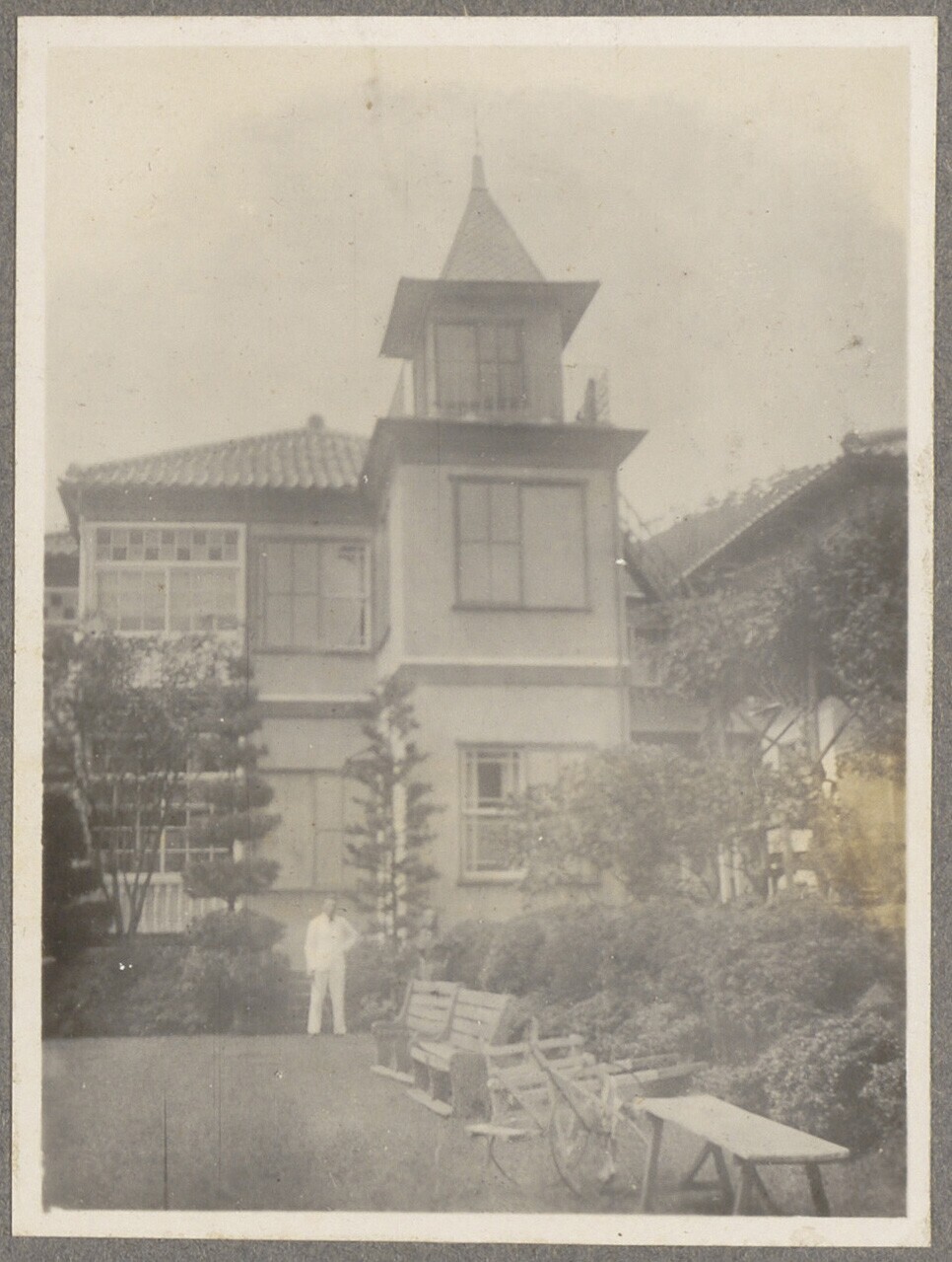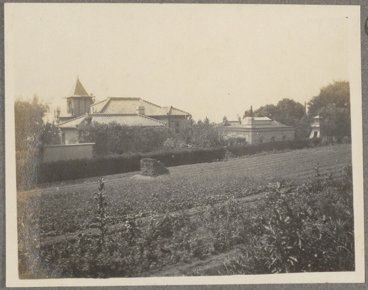 Dorpsgezicht met kerk in Suma, Japan, op de voorgron...