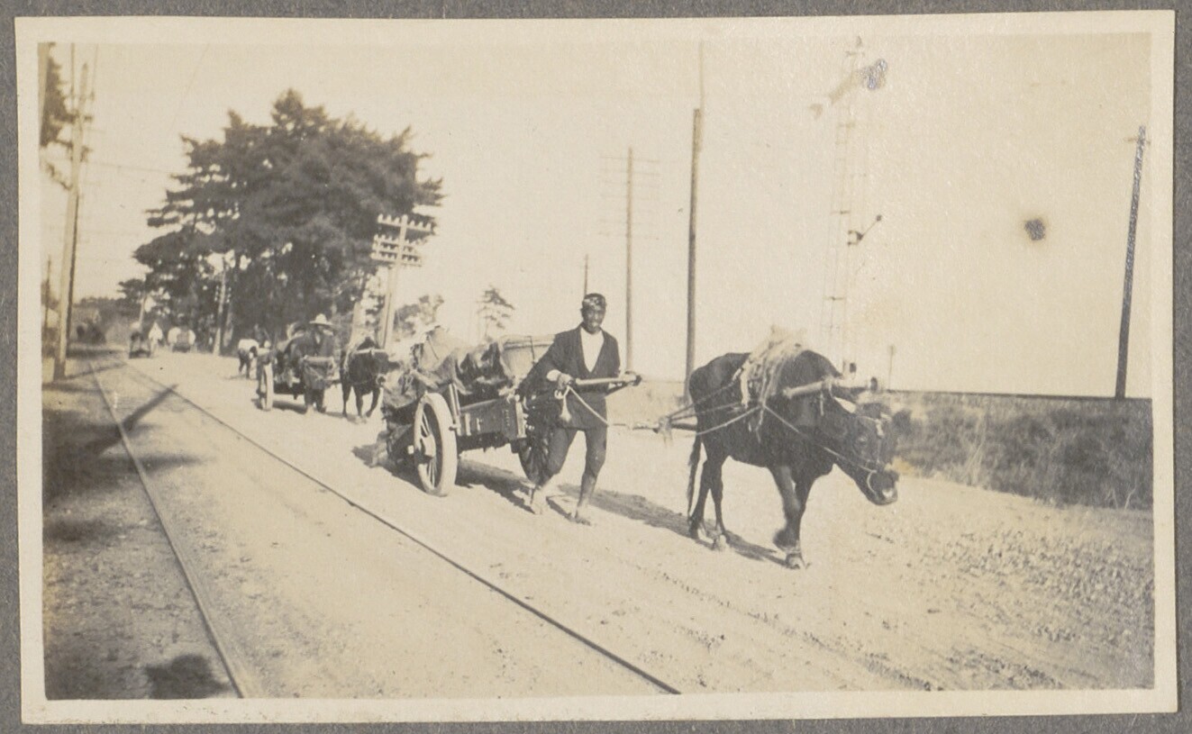 Japanners met ossenkarren op een weg bij Suma, Japan