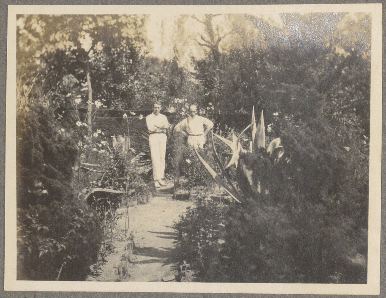Twee mannen met boeken buiten aan tafel in Suma, Japan