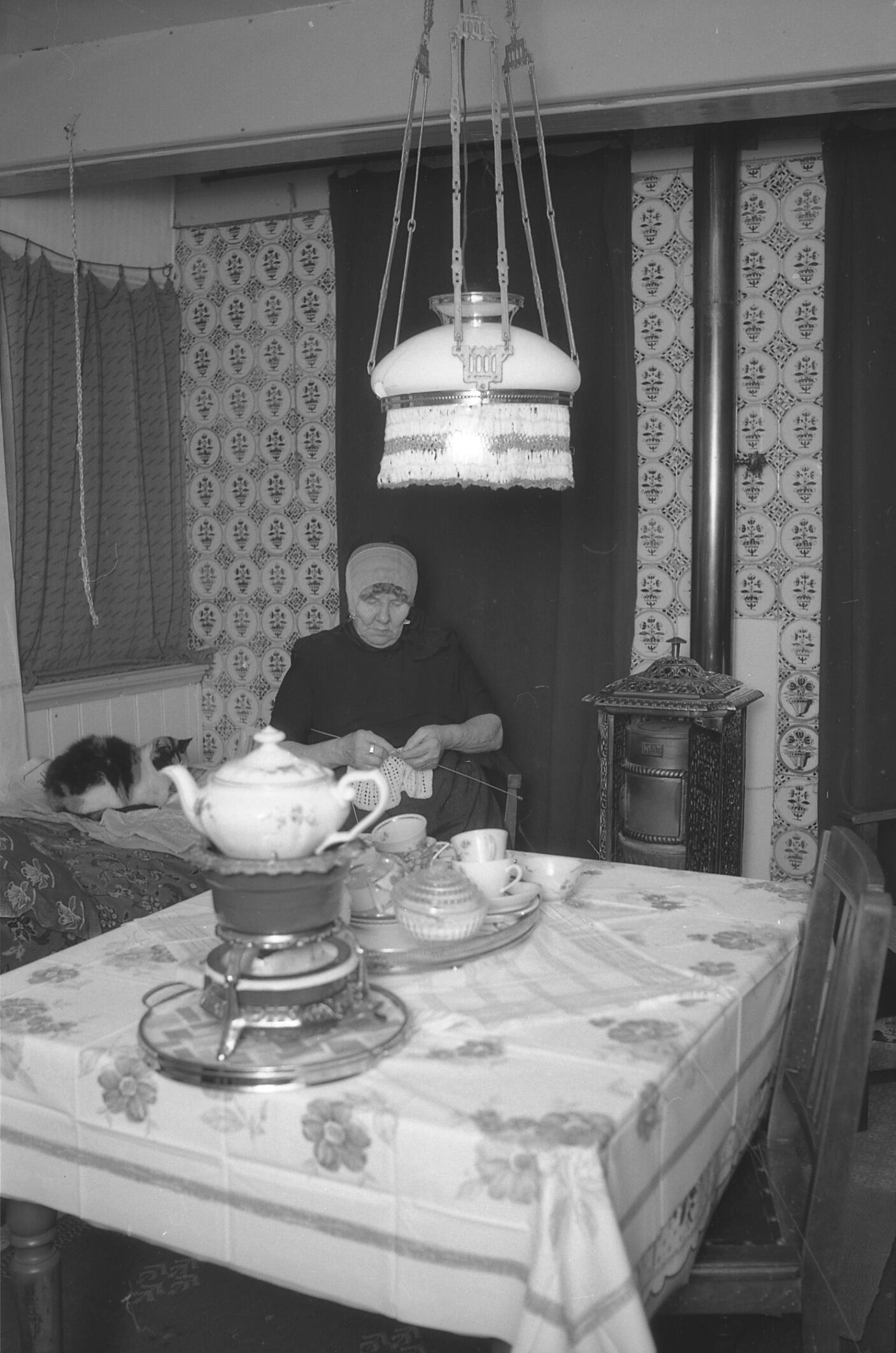 Mevrouw Kroeze aan het breien, Urk, 1965 (zwart-wit ...
