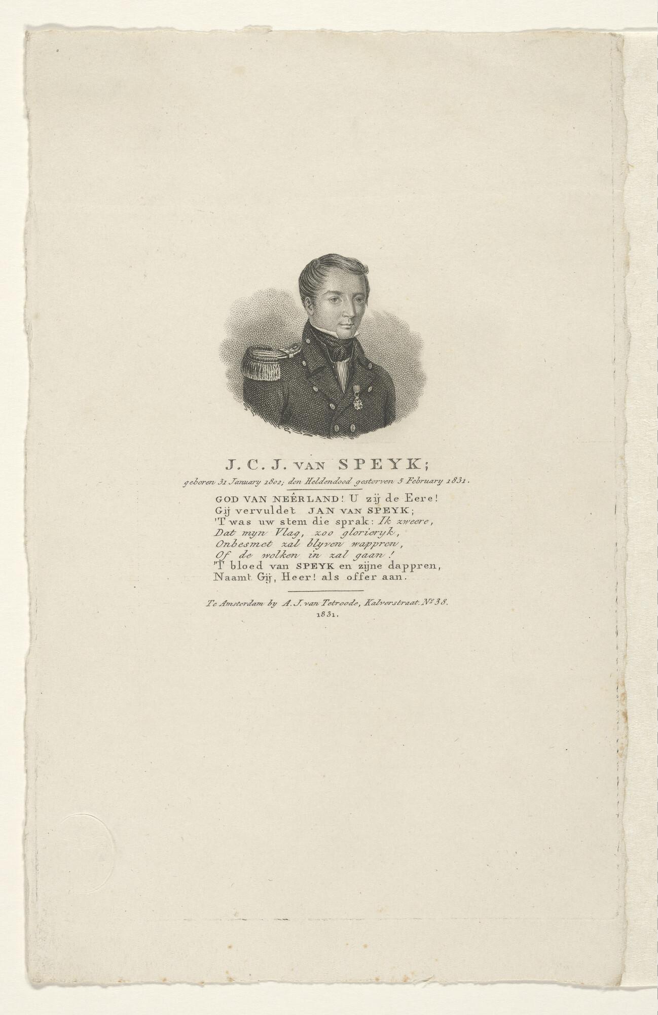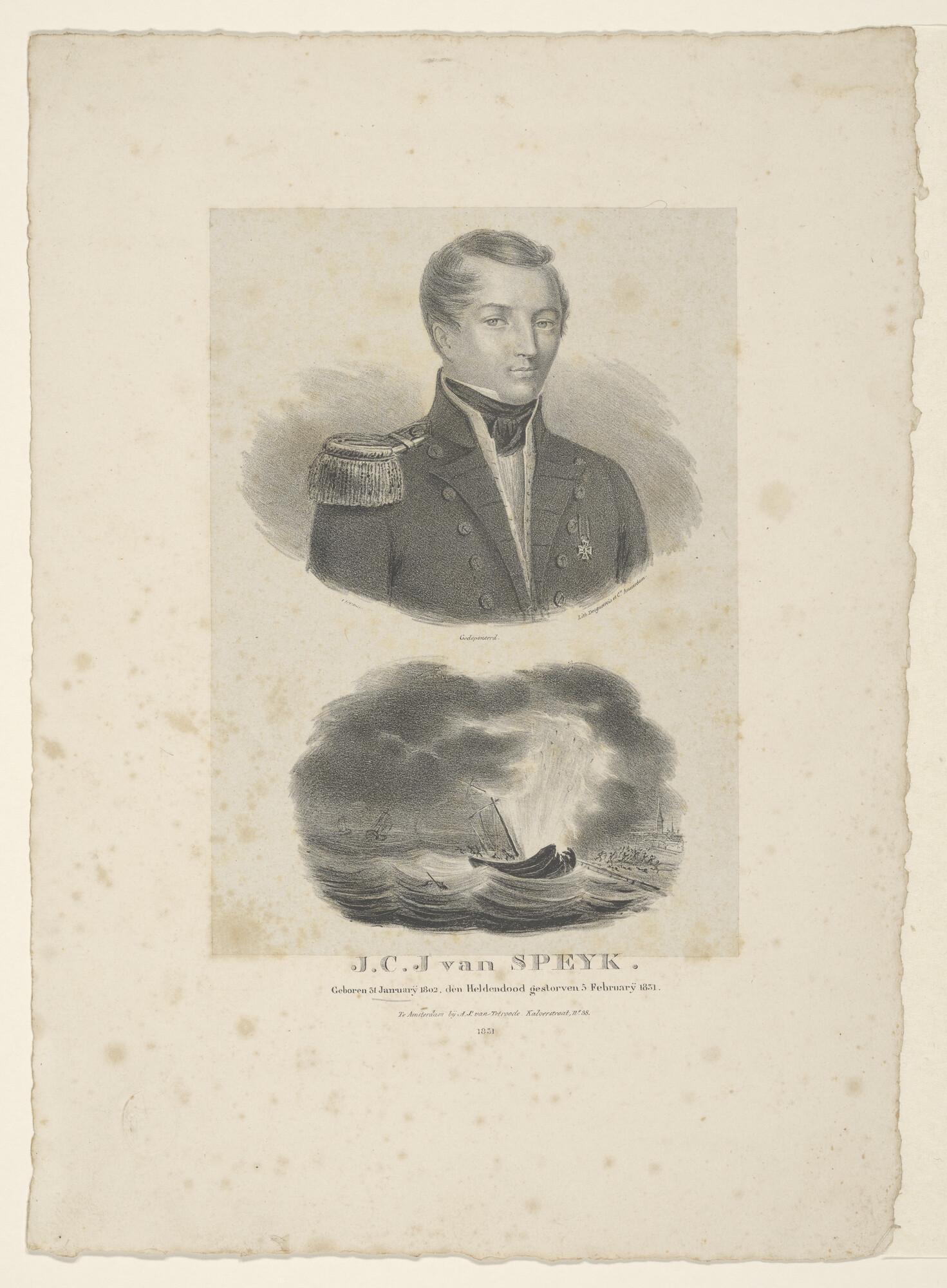 Portret van J.C.J. van Speyk, met daaronder een lofd...