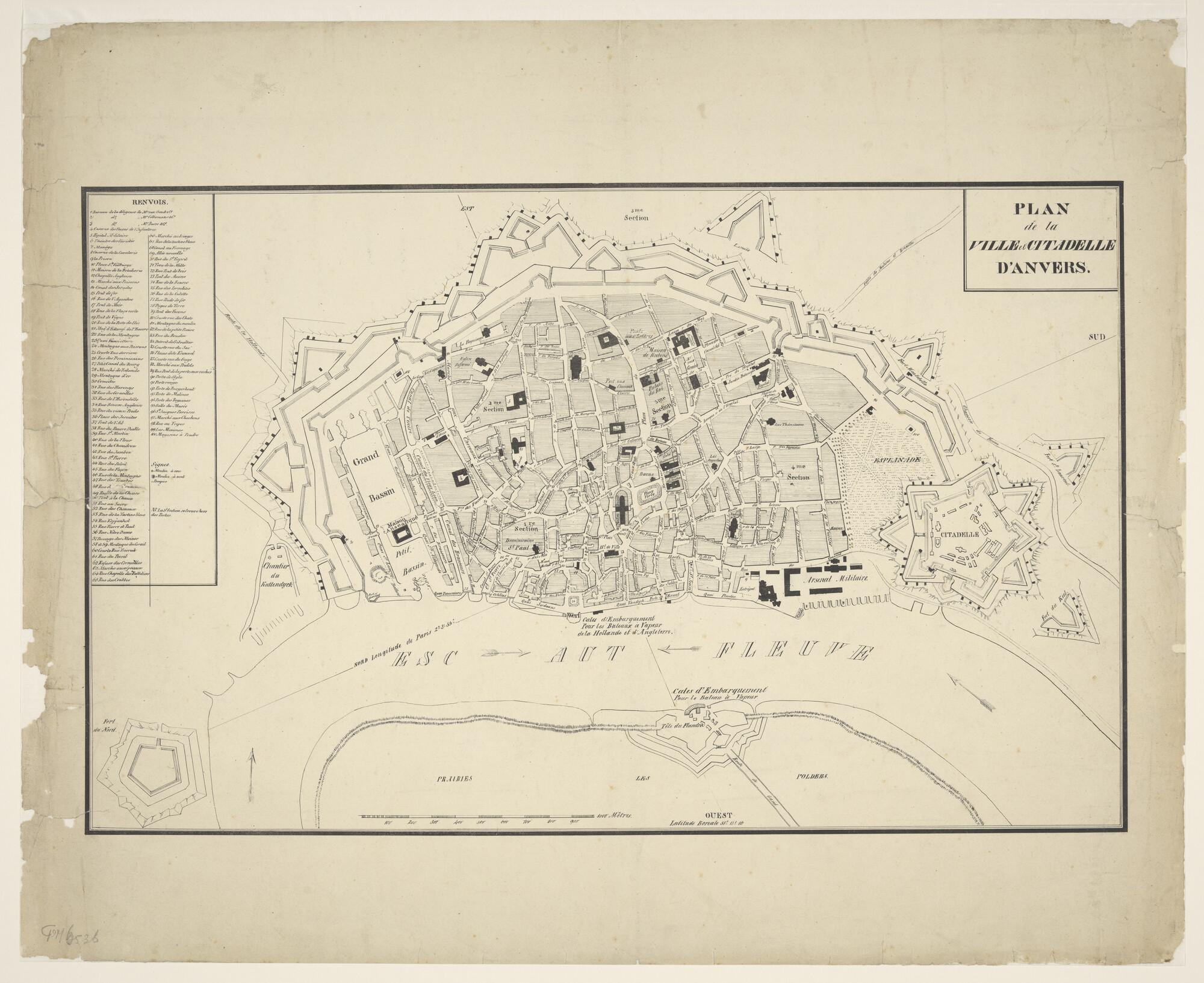 Plattegrond van Antwerpen: bovenaan de stad en Citadel