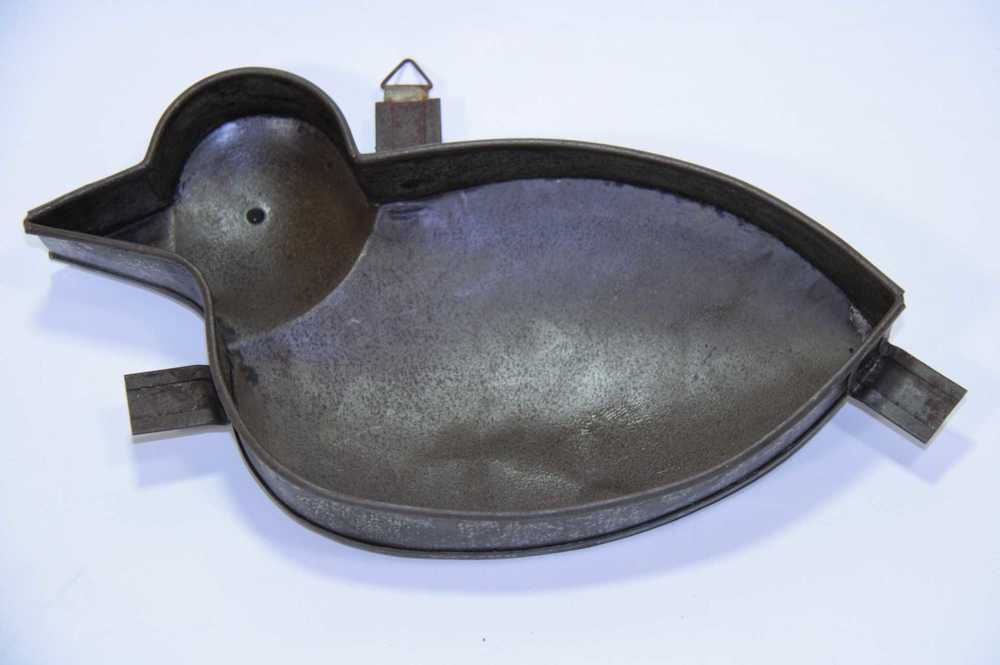 Taartvorm van metaal in de vorm van een eend op drie...