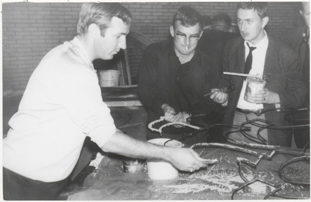 Drie mannen aan het werk achter werktafel, gasslangen?