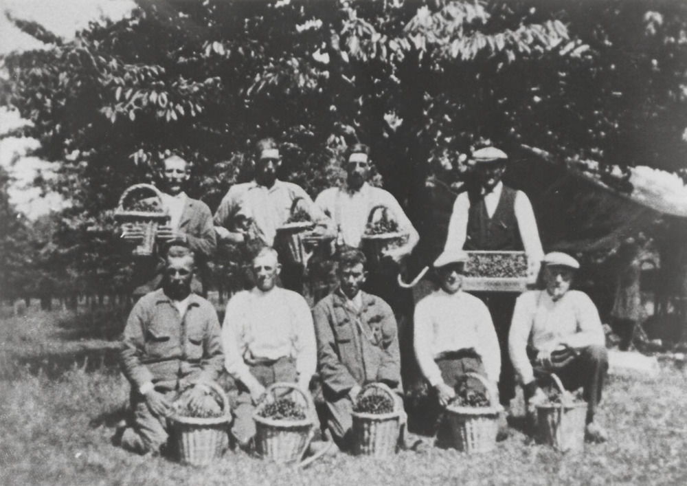 datum n.b. Een ploeg kersenplukkers in de boomgaard.