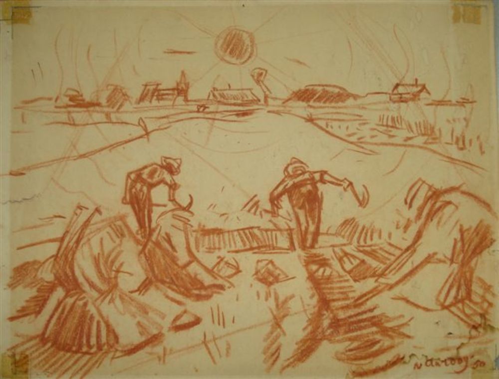 tekening in roodkrijt, landarbeiders, 1950 Jan van A...