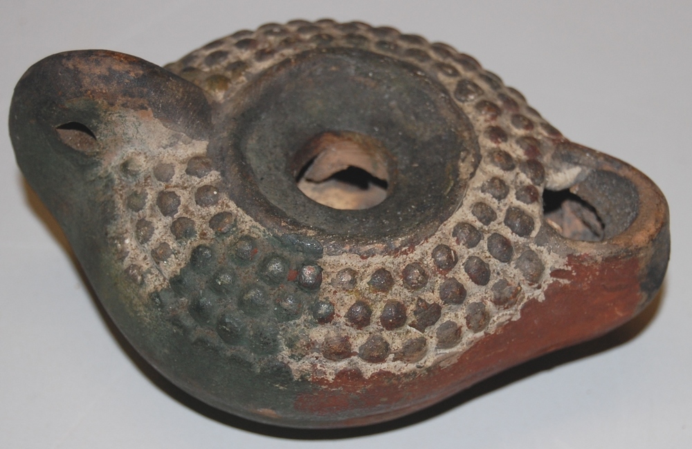 Romeins olielampje in de kleuren groen en oker Catac...