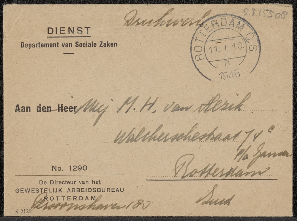 Enveloppe van het Gewestelijk Arbeidsbureau Rotterda...