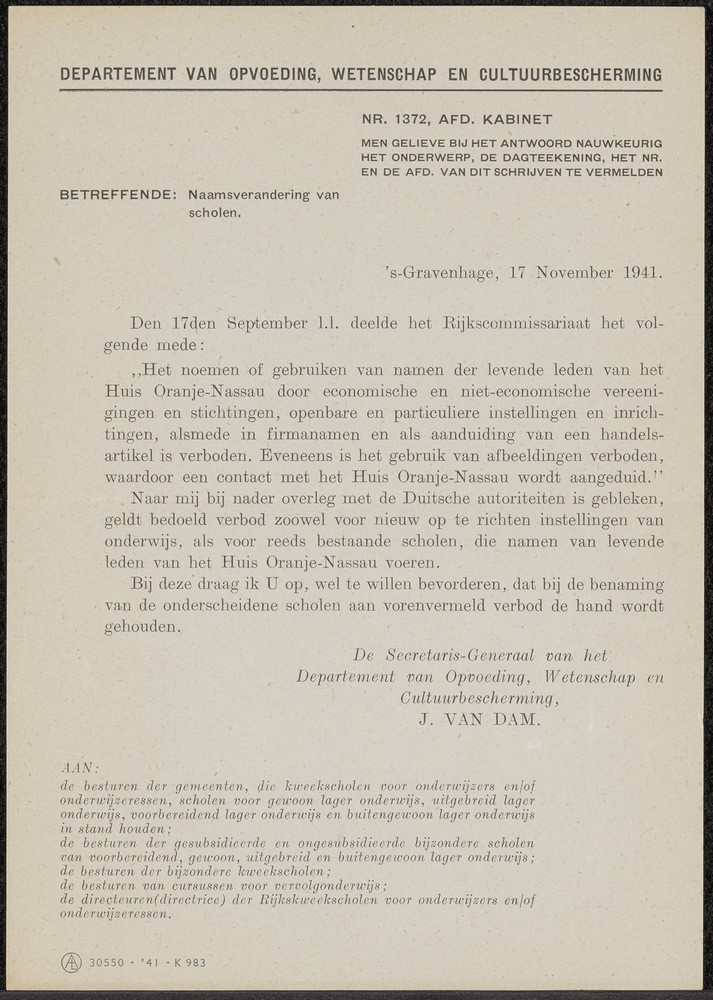 Brief van het Departement van Opvoeding, Wetenschap ...