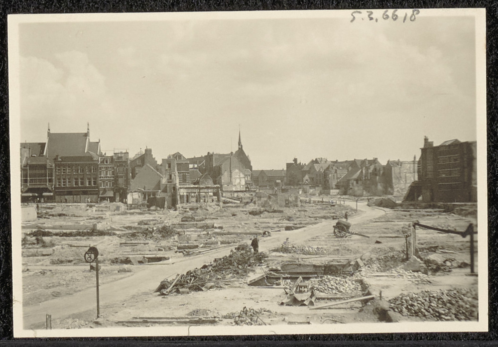 Ruïne Houtstraat richting Broerstraat na de bevrijdi...