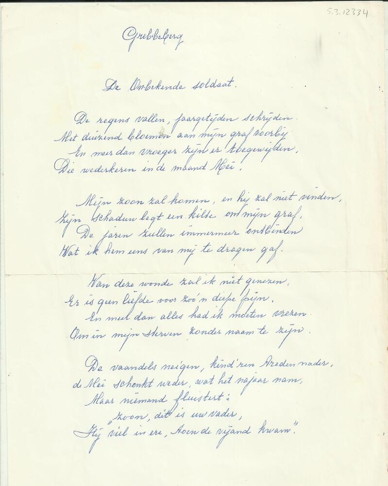 Vel met gedicht Grebbeberg/De onbekende soldaat.