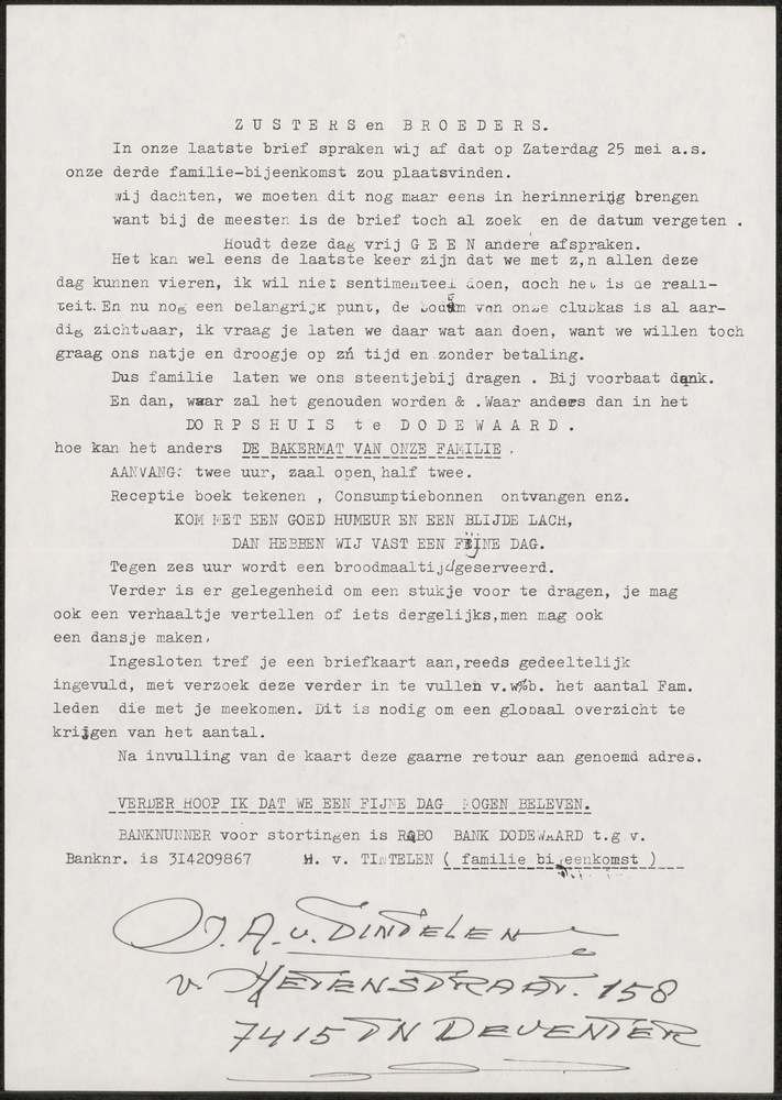 brief J.E.R. Le Lorrain aan Reünisten Pematang Siantar