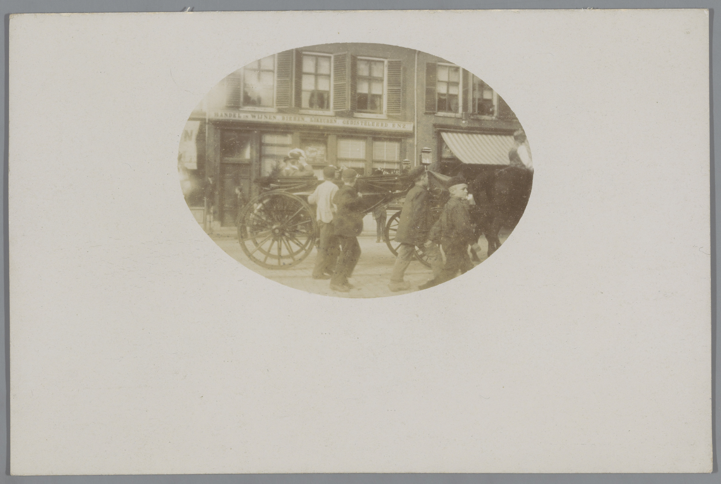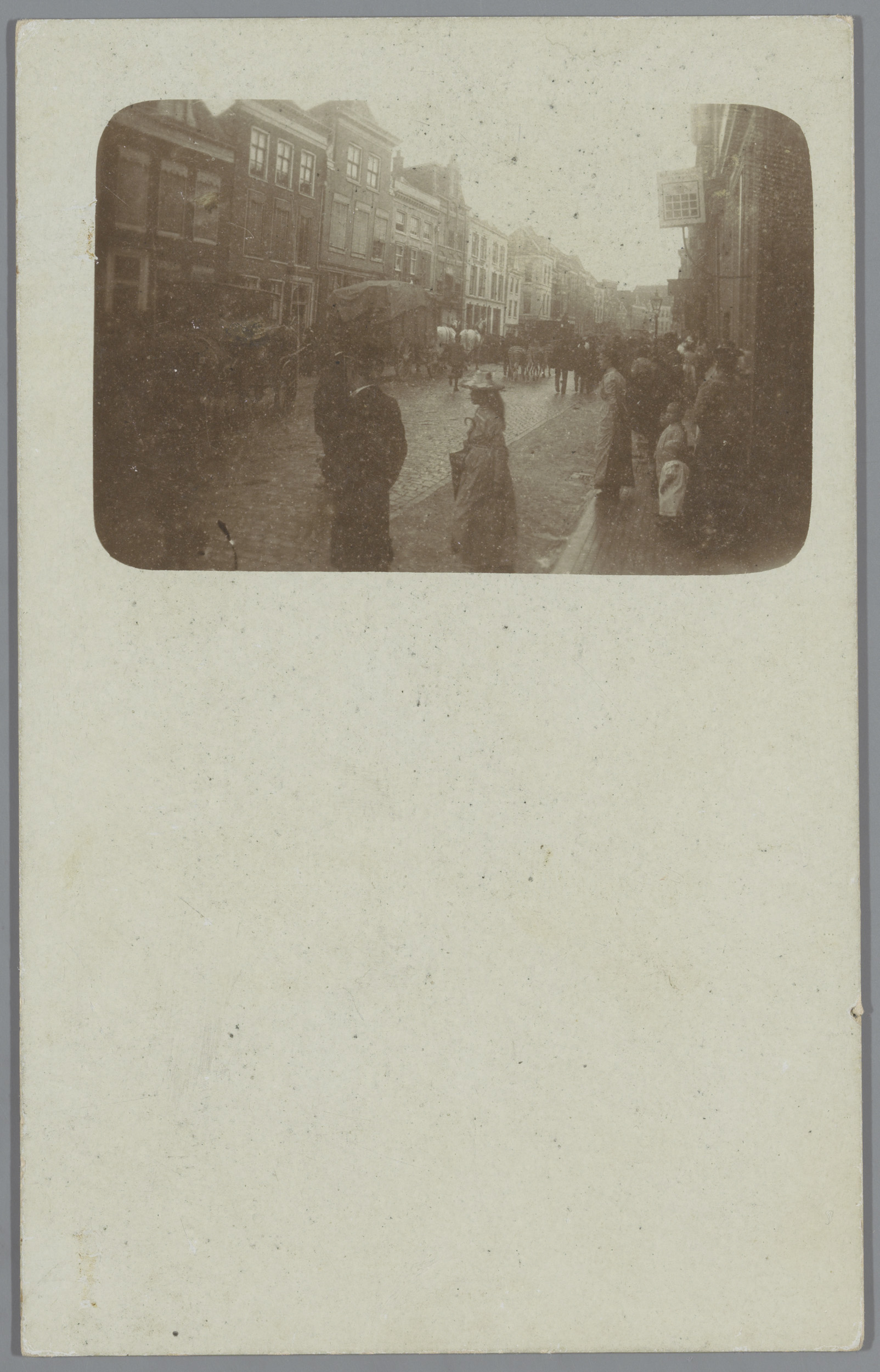 Gezicht op een straat met (vermoedelijk) een begrafe...