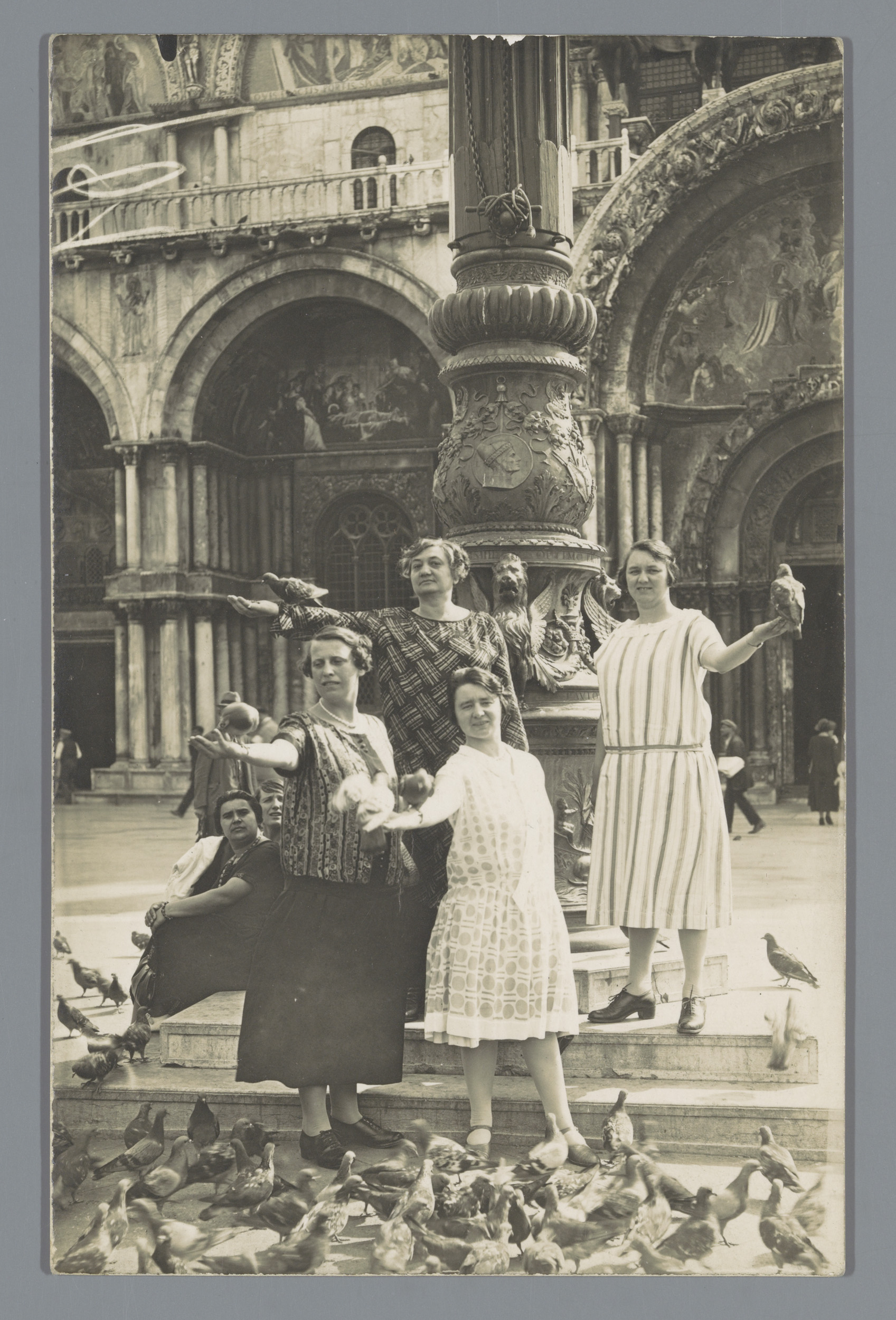 Vier onbekende vrouwen voeren duiven op het San Marc...
