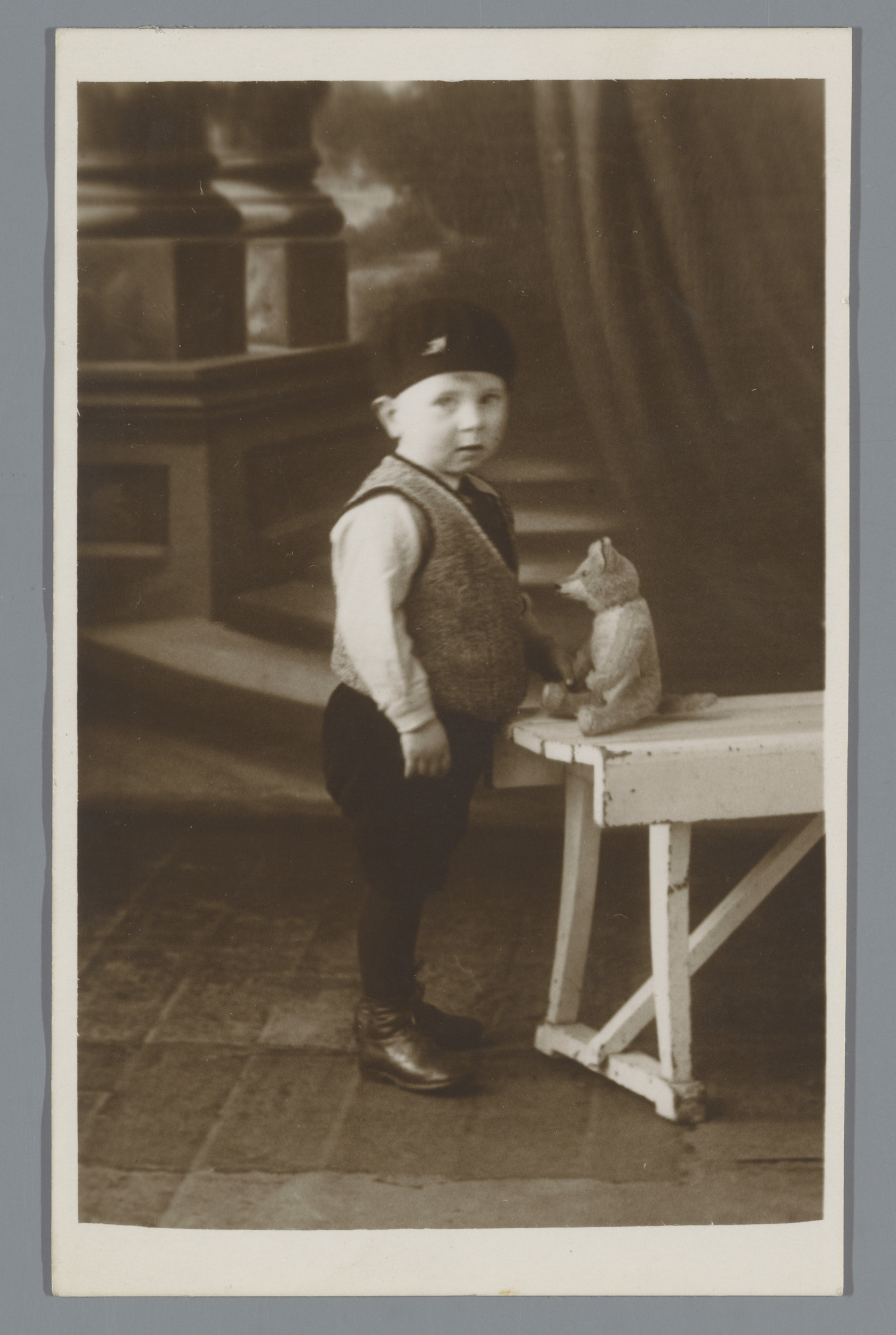 Studioportret van een onbekende jongen met een knuff...