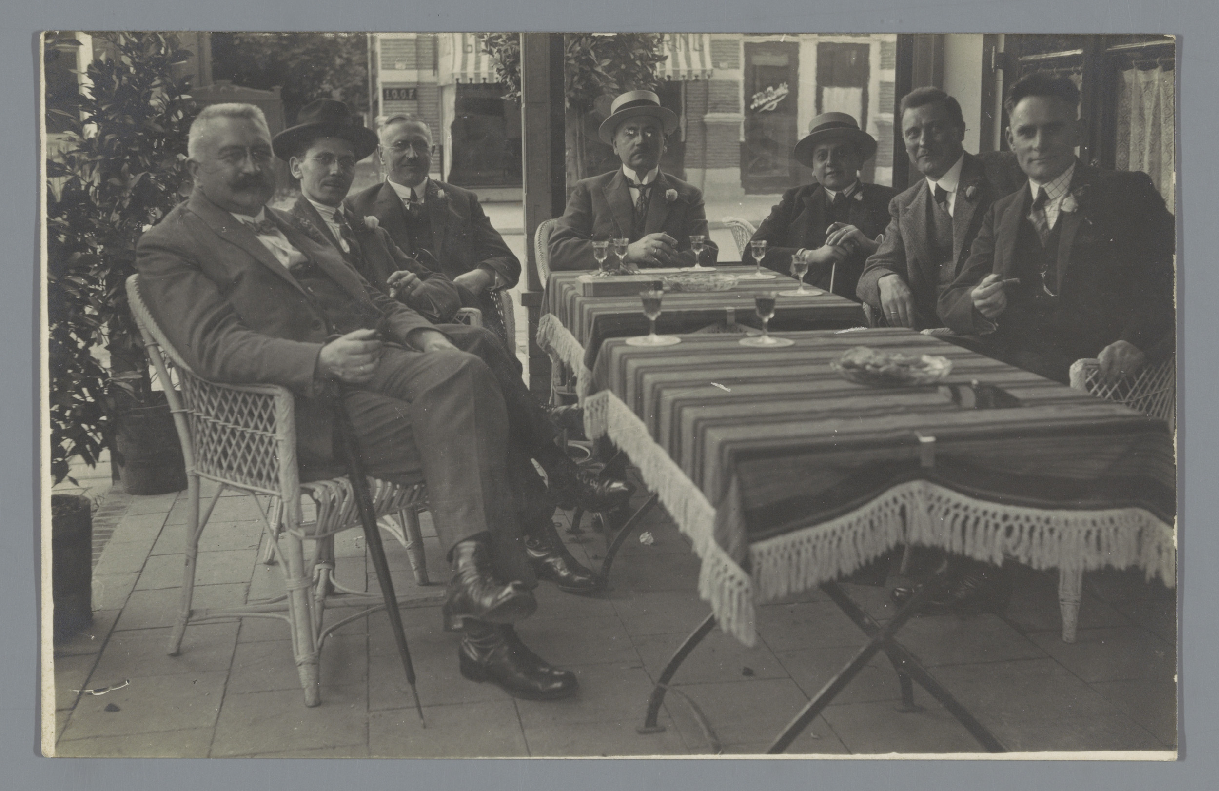 Groepsportret van zeven onbekende mannen rond een tafel