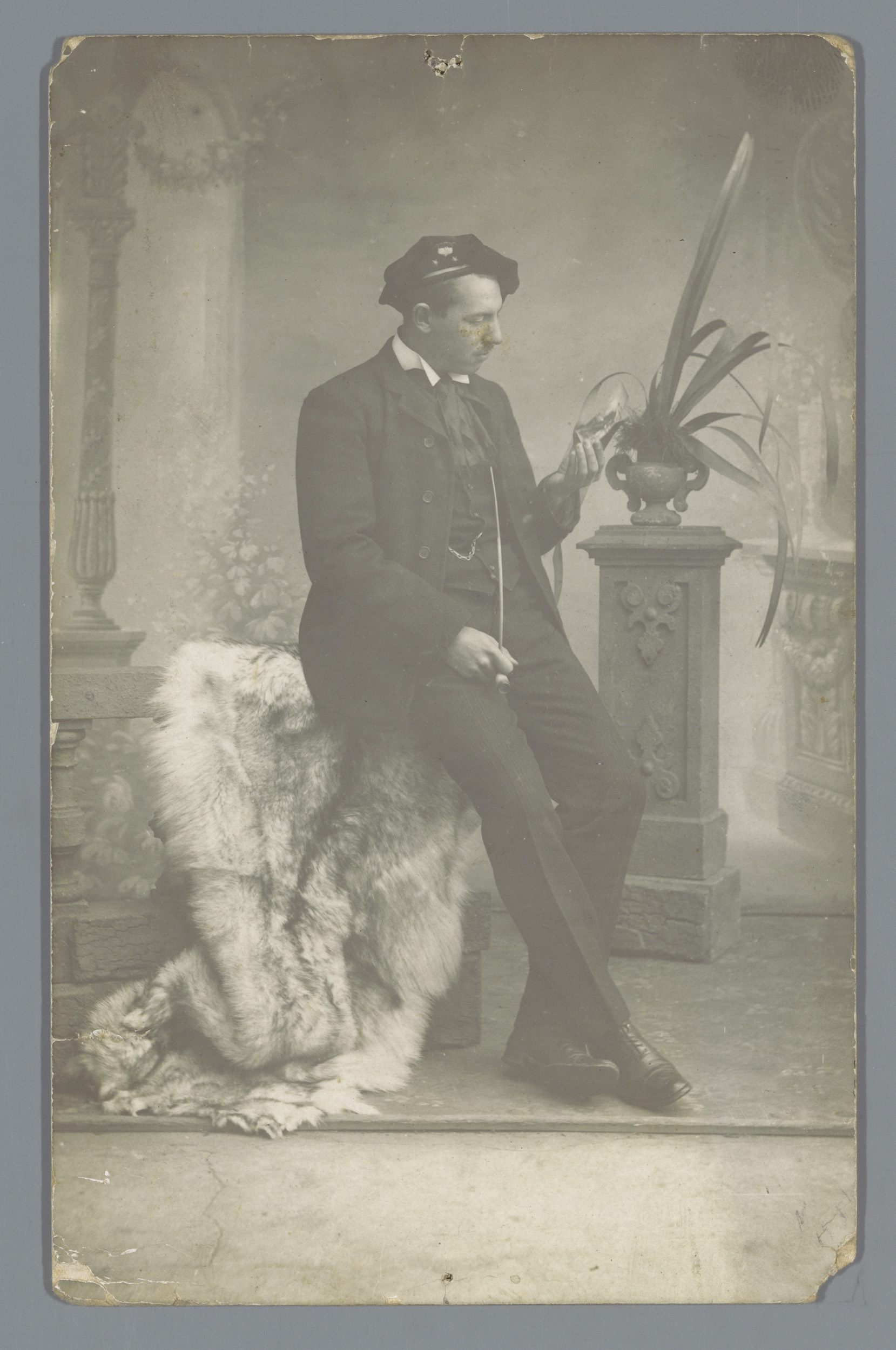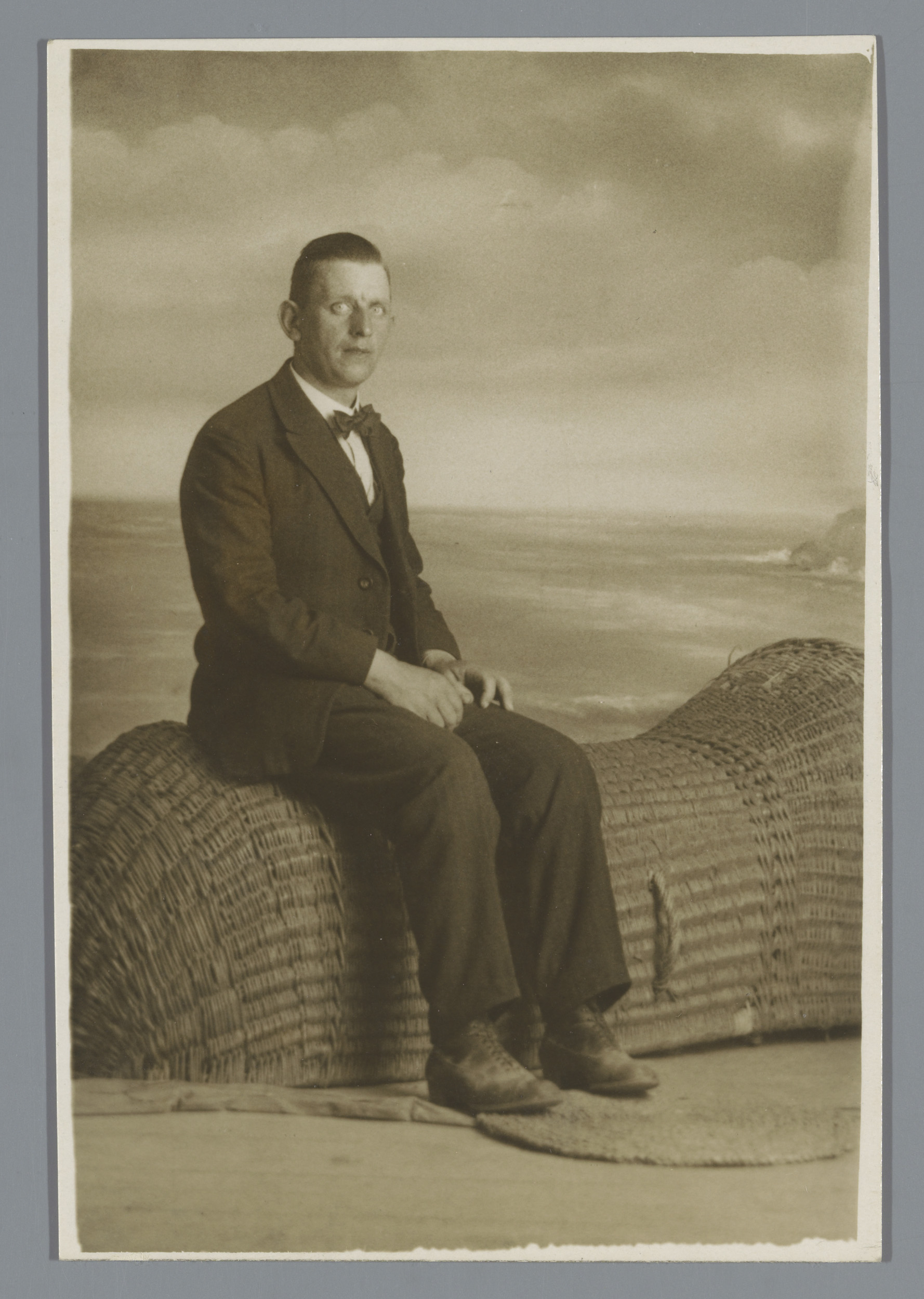 Studioportret van een onbekende man op een rieten st...