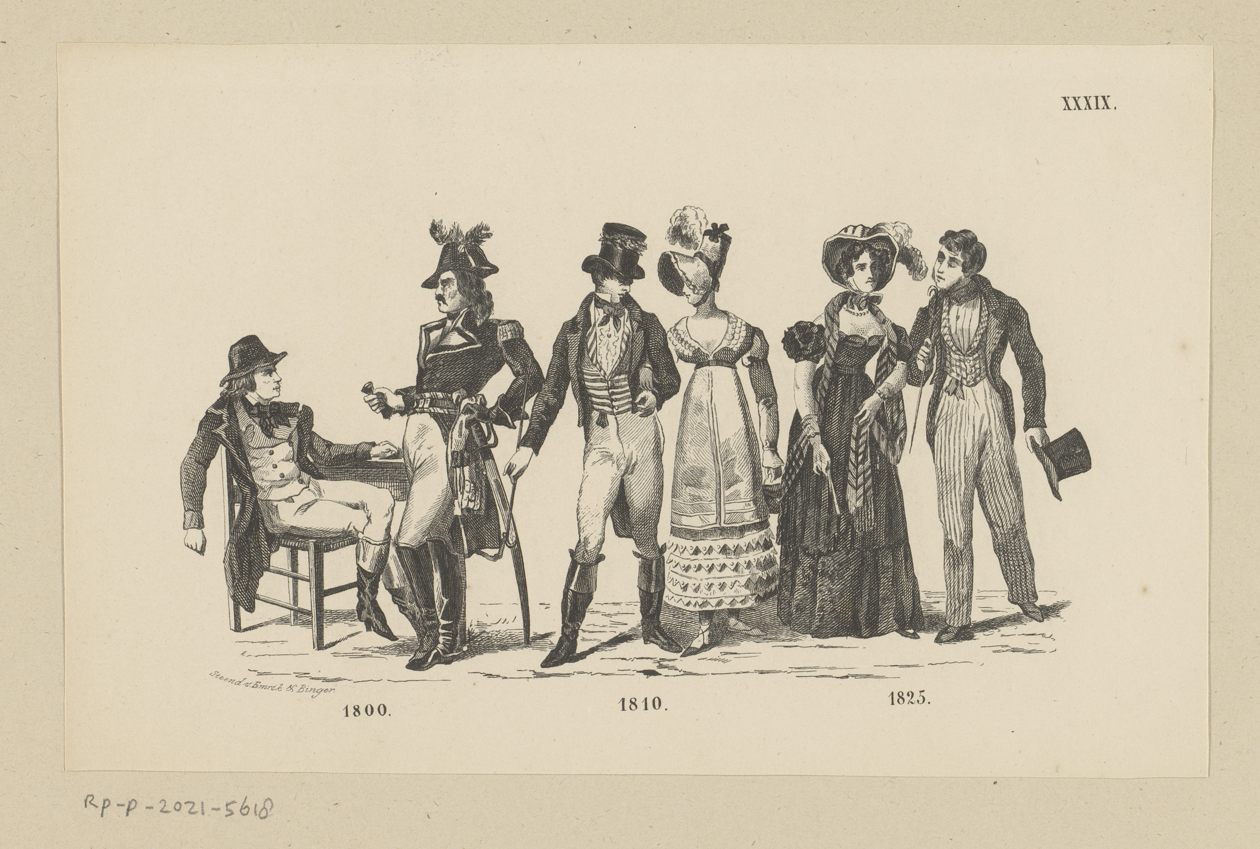 Zes mannen en vrouwen in kleding uit 1800, 1810 en 1825